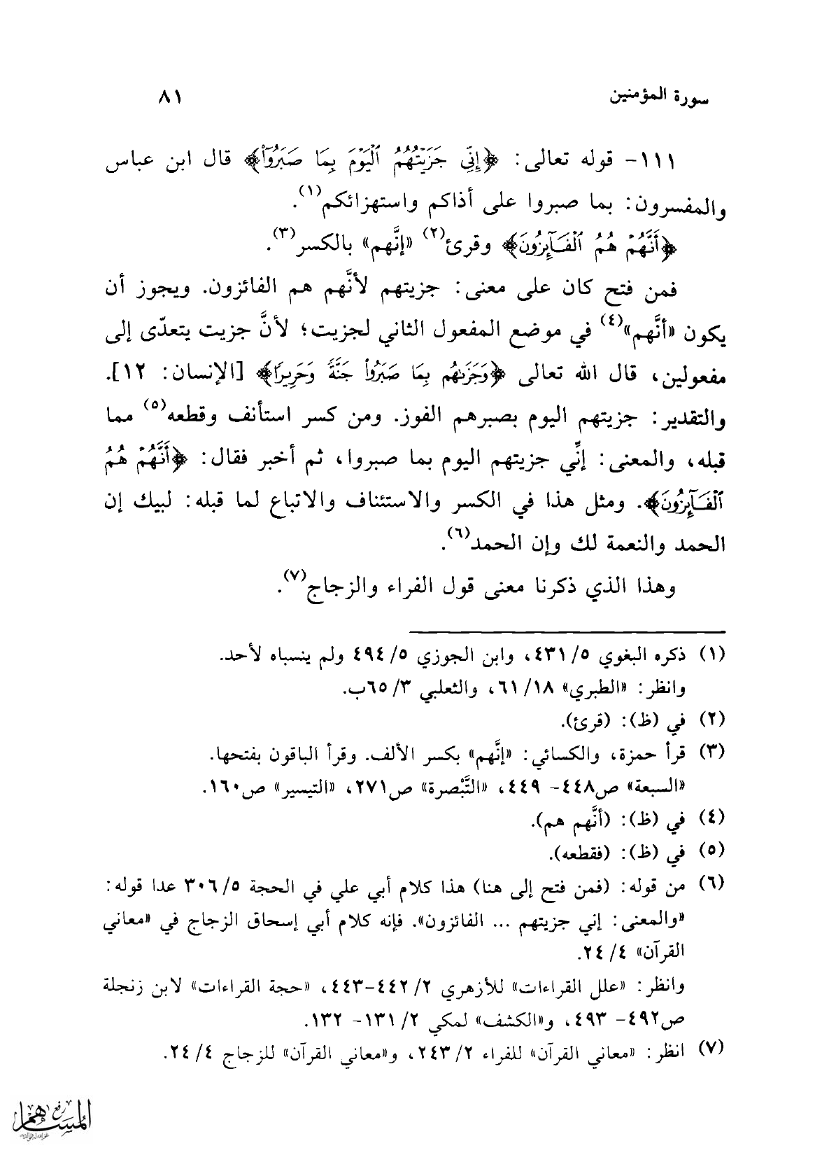 (¬6) من قوله: (فمن فتح إلى هنا) هذا كلام أبي علي في الحجة 5/ 306 عدا قوله: "والمعنى: إني جزيتهم ... الفائزون". فإنه كلام أبي إسحاق الزجاج في "معاني القرآن" 4/ 24.
