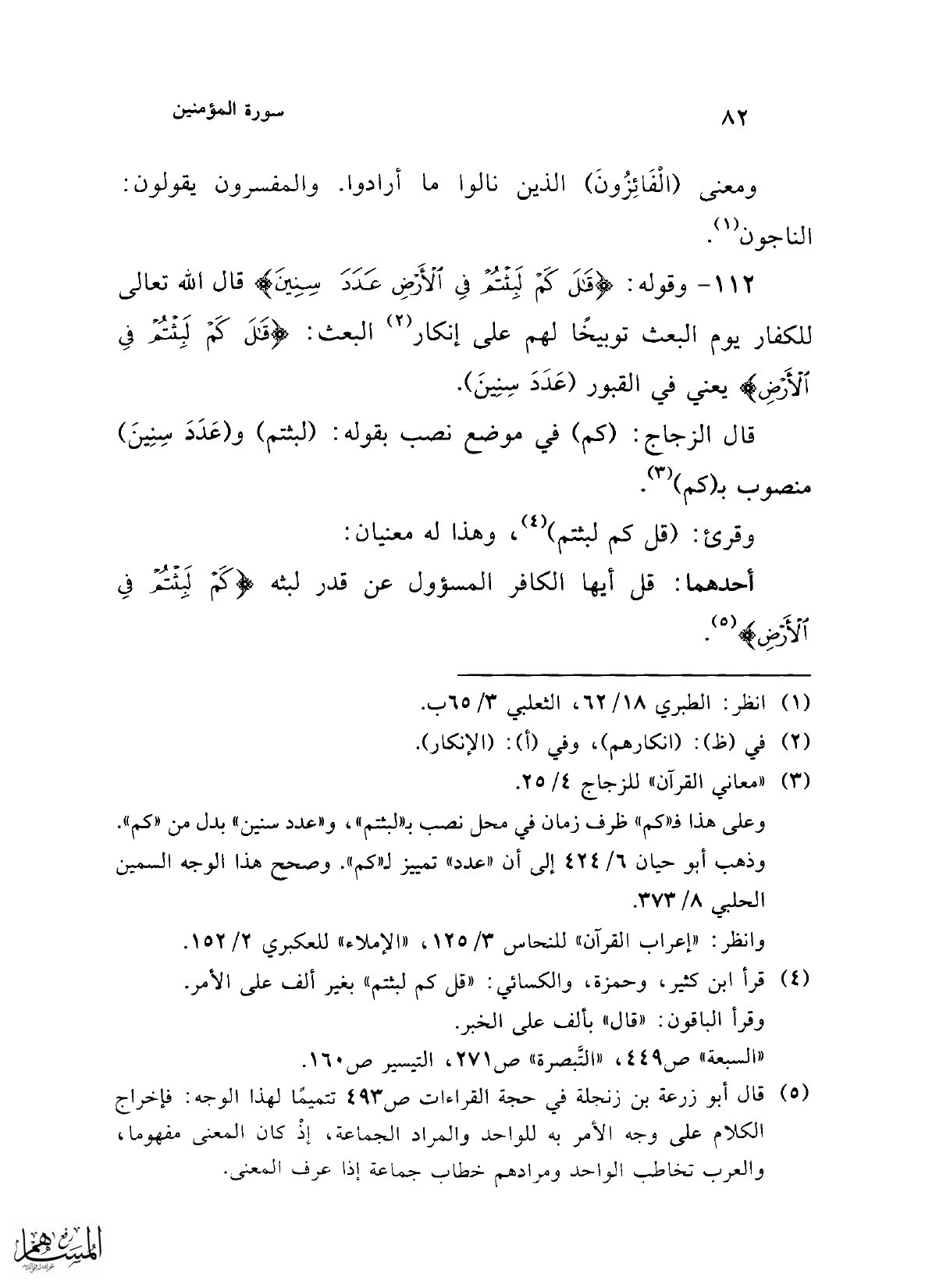 112 - وقوله: {قَالَ كَمْ لَبِثْتُمْ فِي الْأَرْضِ عَدَدَ سِنِينَ} قال الله تعالى للكفار يوم البعث توبيخًا لهم على إنكار (¬2) البعث: {قَالَ كَمْ لَبِثْتُمْ فِي الْأَرْضِ} يعني في القبور {عَدَدَ سِنِينَ}.