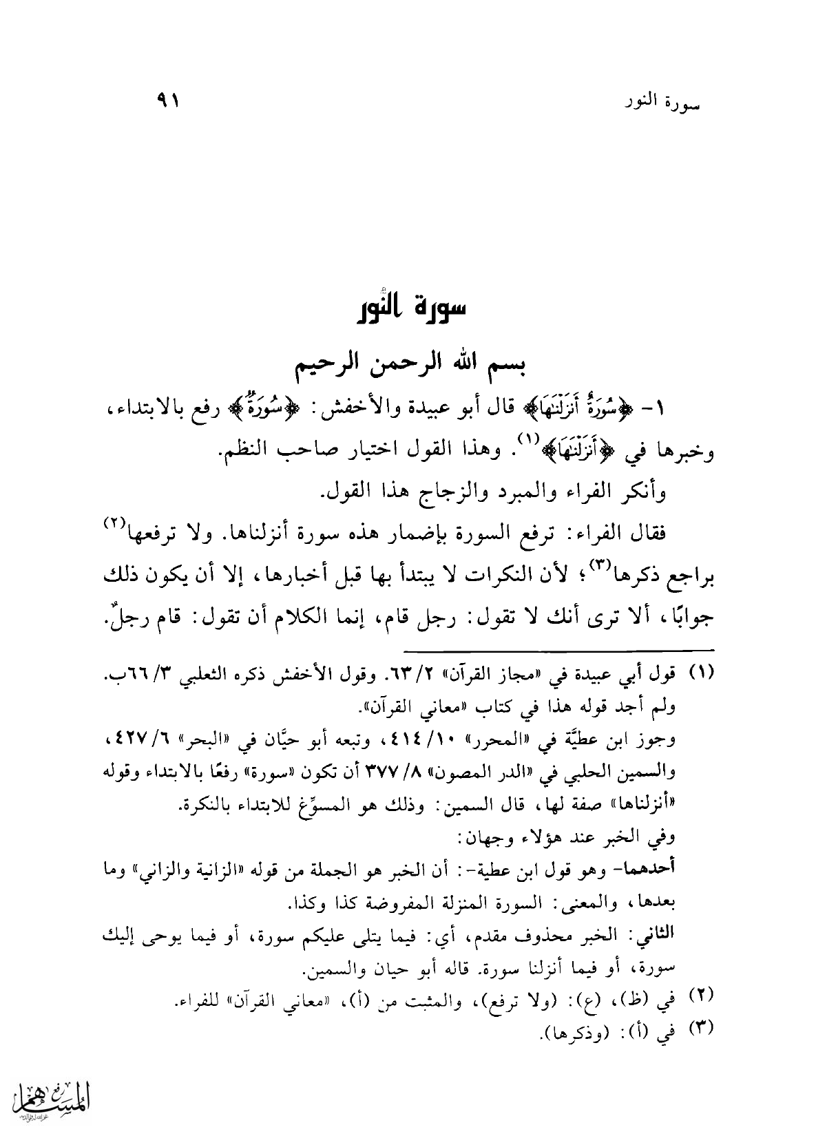 1 - {سُورَةٌ أَنْزَلْنَاهَا} قال أبو عبيدة والأخفش: {سُورَةٌ} رفع بالابتداء، وخبرها في {أَنْزَلْنَاهَا} (¬1). وهذا القول اختيار صاحب النظم.