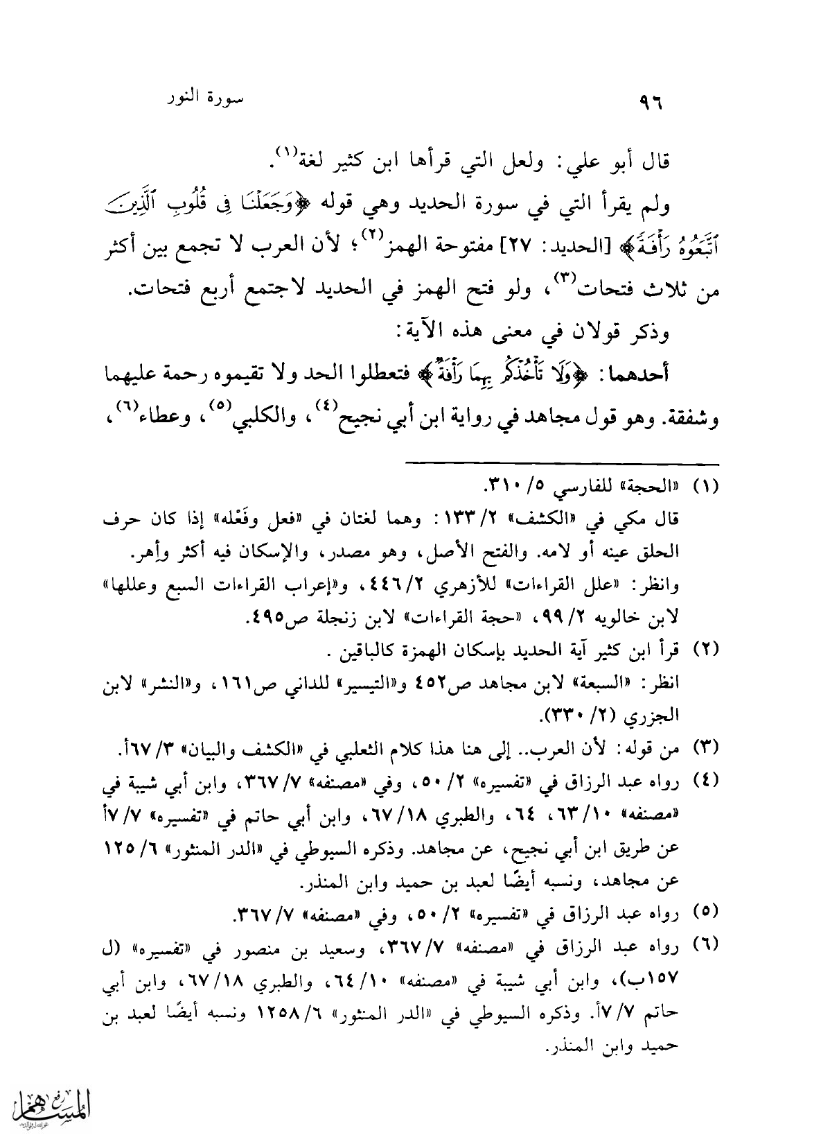 ولم يقرأ التي في سورة الحديد وهي قوله {وَجَعَلْنَا فِي قُلُوبِ الَّذِينَ اتَّبَعُوهُ رَأْفَةً} [الحديد: 27] مفتوحة الهمز (¬2)؛ لأن العرب لا تجمع بين أكثر من ثلاث فتحات (¬3)، ولو فتح الهمز في الحديد لاجتمع أربع فتحات.