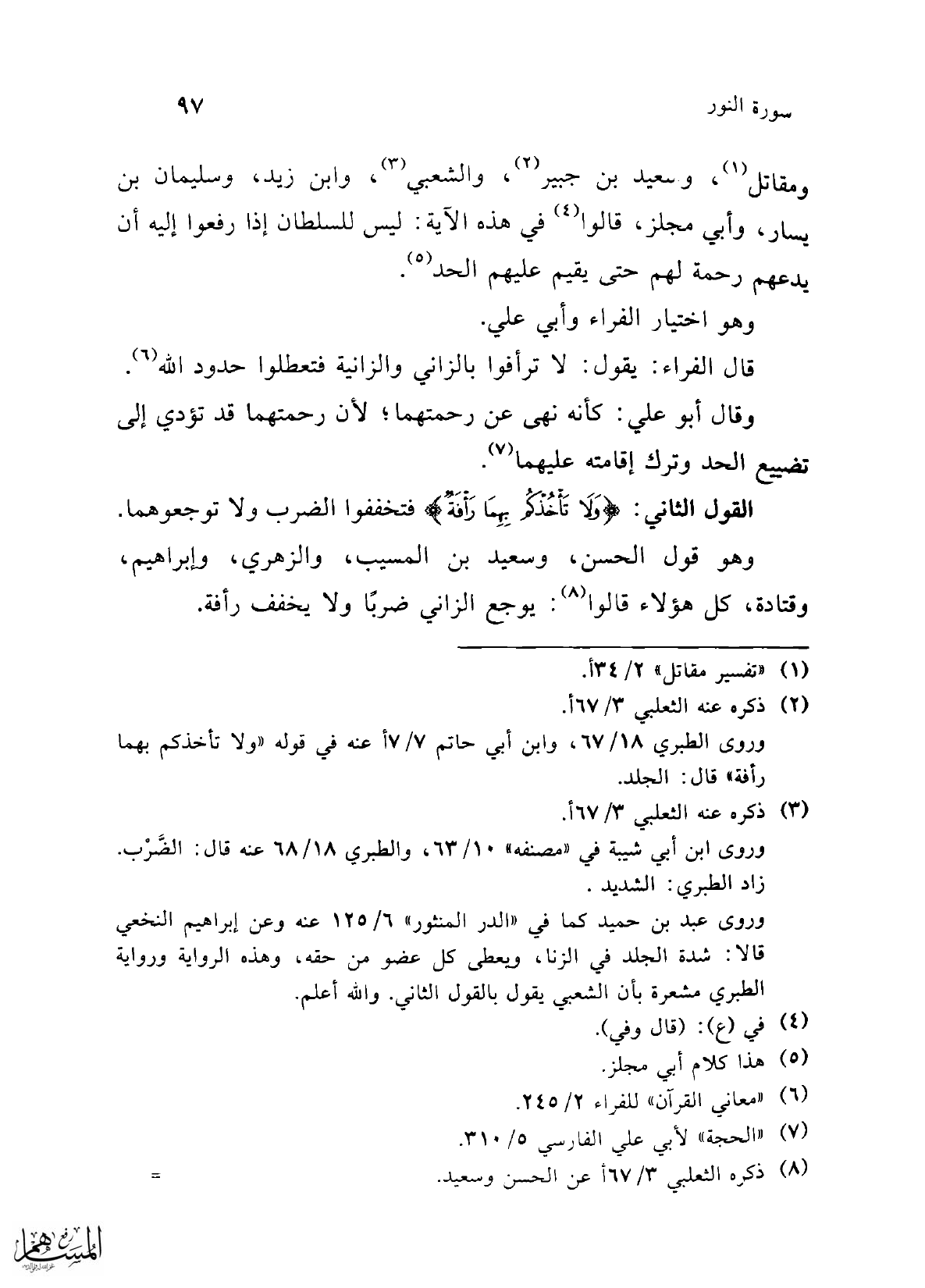 وروى عبد بن حميد كما في "الدر المنثور" 6/ 125 عنه وعن إبراهيم النخعي قالا: شدة الجلد في الزنا، ويعطى كل عضو من حقه، وهذه الرواية ورواية الطبري مشعرة بأن الشعبي يقول بالقول الثاني. والله أعلم.