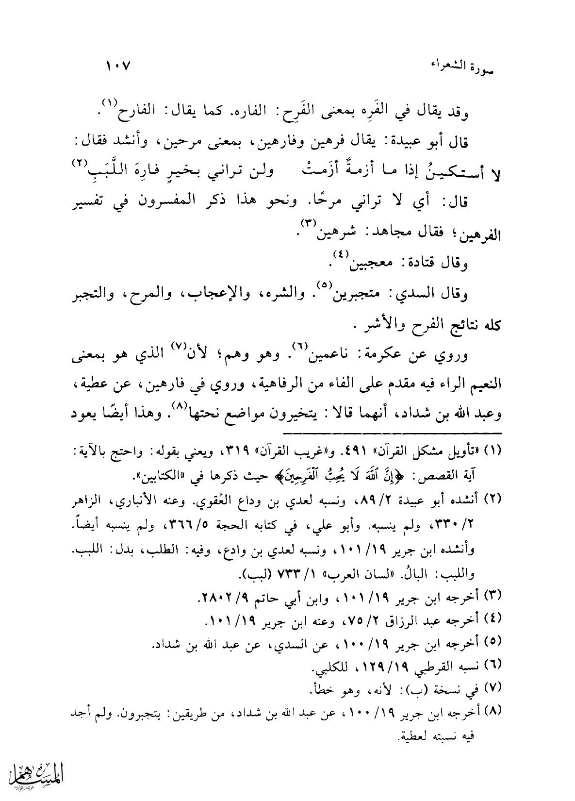 (¬1) "تأويل مشكل القرآن" 491. و"غريب القرآن" 319، ويعني بقوله: واحتج بالآية: آية القصص: {إِنَّ اللَّهَ لَا يُحِبُّ الْفَرِحِينَ} حيث ذكرها في "الكتابين".