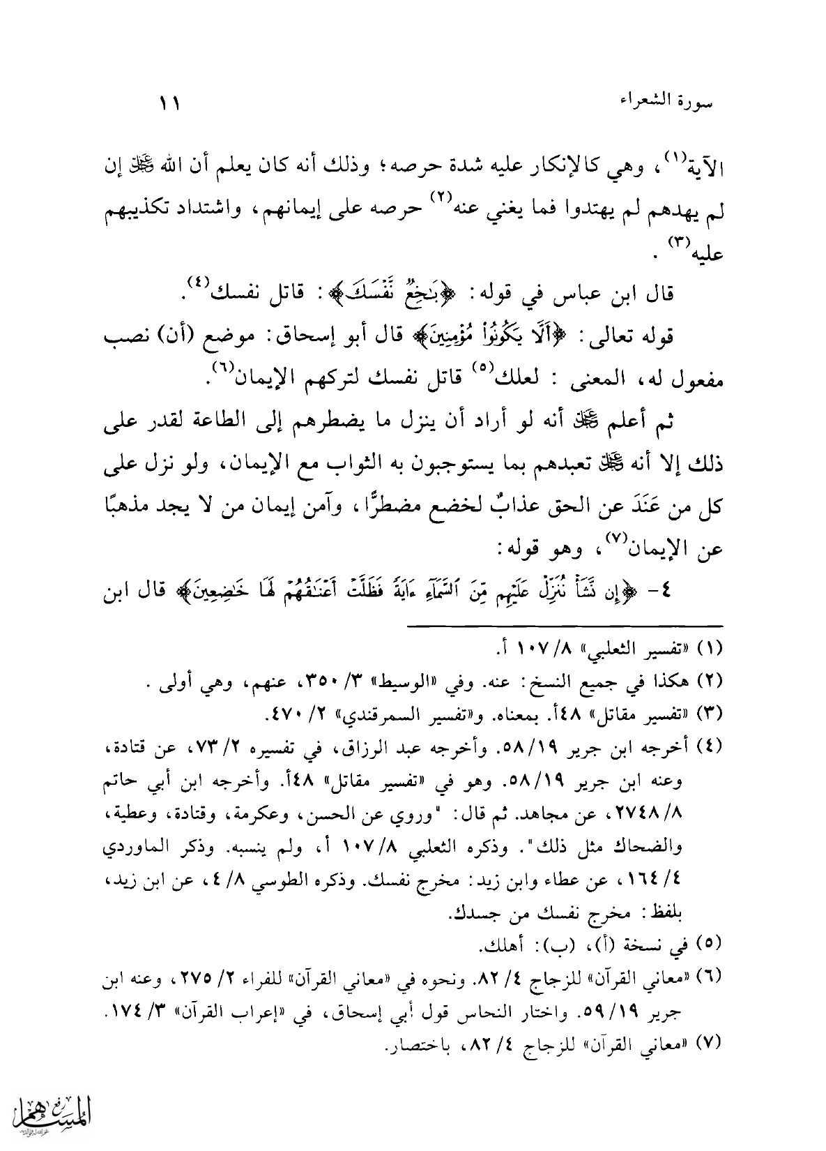قوله تعالى: {أَلَّا يَكُونُوا مُؤْمِنِينَ} قال أبو إسحاق: موضع (أن) نصب مفعول له، المعنى: لعلك (¬5) قاتل نفسك لتركهم الإيمان (¬6).