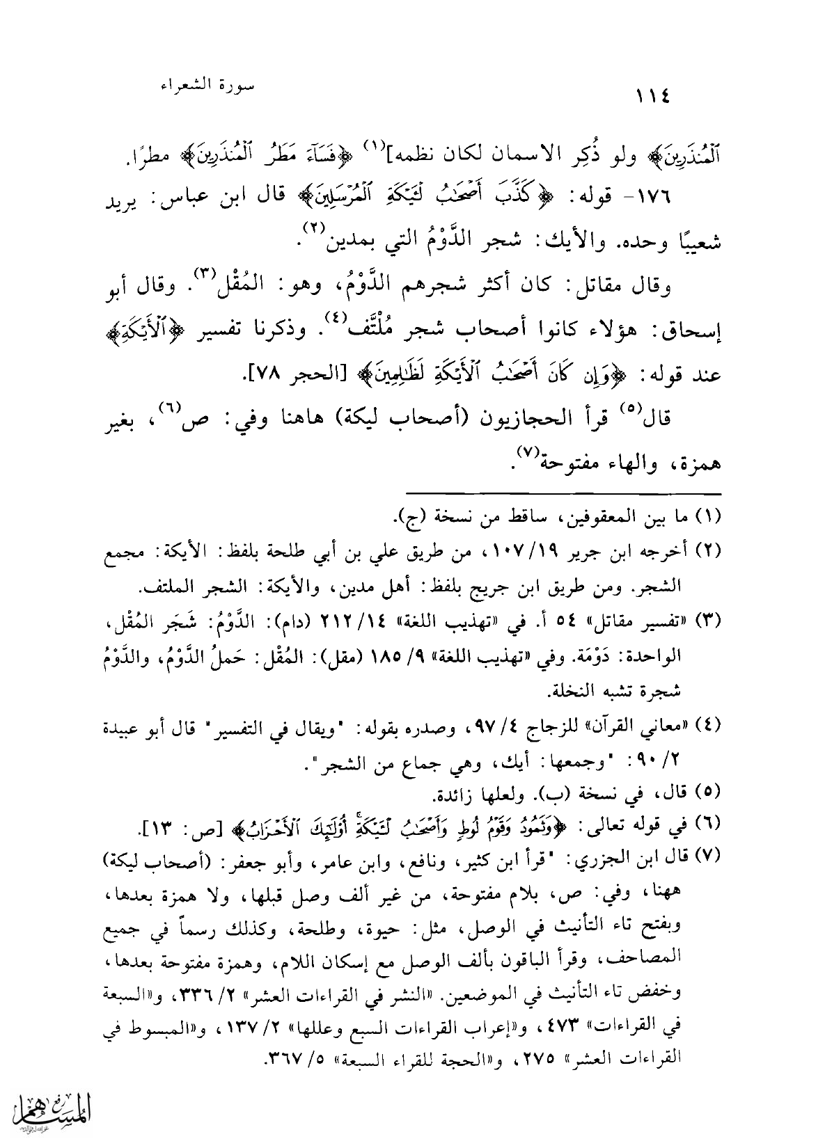 176 - قوله: {كَذَّبَ أَصْحَابُ الْأَيْكَةِ الْمُرْسَلِينَ} قال ابن عباس: يريد شعيبًا وحده. والأيك: شجر الدَّوْمُ التي بمدين (¬2).