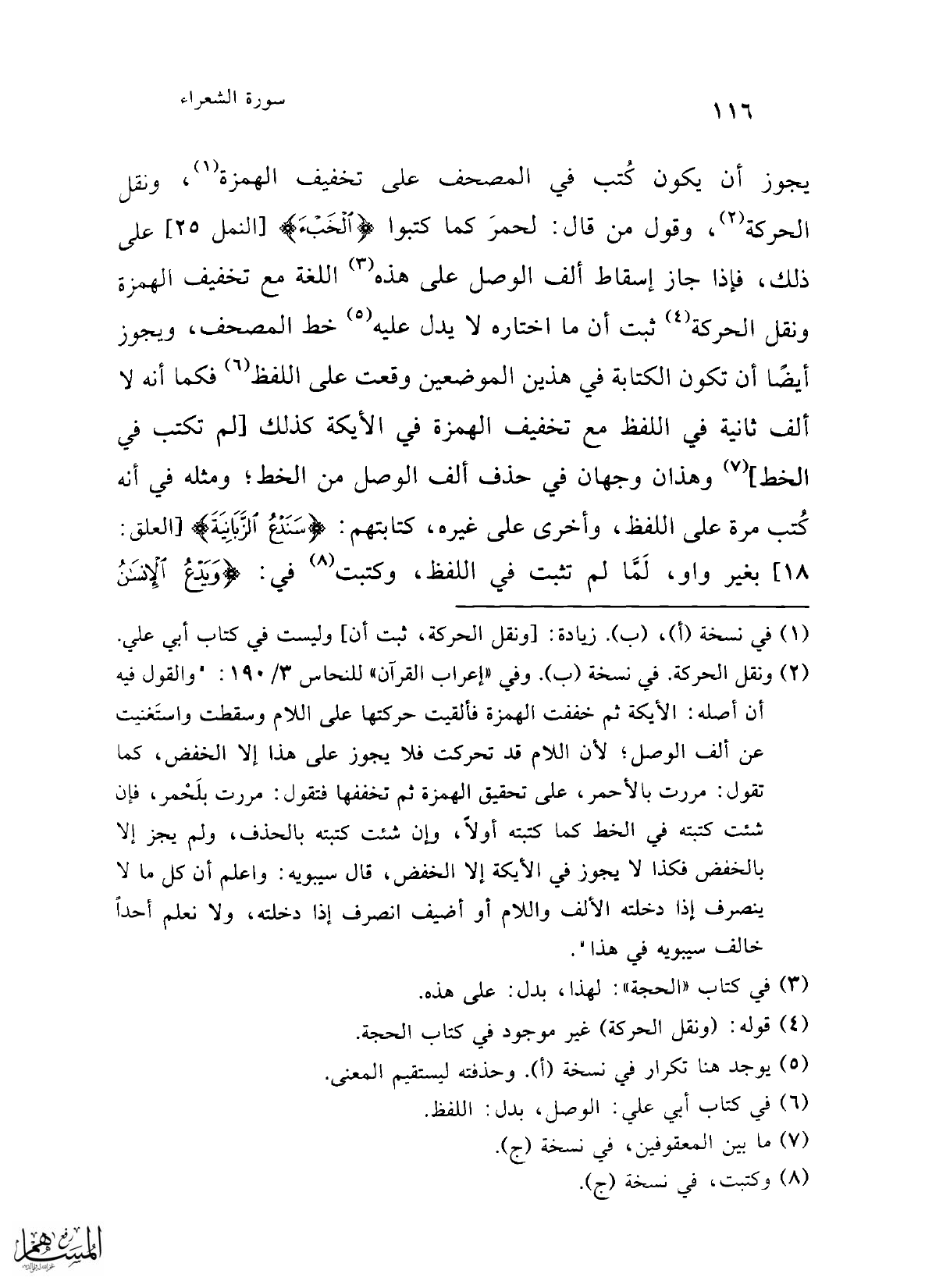 يجوز أن يكون كُتب في المصحف على تخفيف الهمزة (¬1)، ونقل الحركة (¬2)، وقول من قال: لحمرَ كما كتبوا {الْخَبْء} [النمل: 25] على ذلك، فإذا جاز إسقاط ألف الوصل على هذه (¬3) اللغة مع تخفيف الهمزة ونقل الحركة (¬4) ثبت أن ما اختاره لا يدل عليه (¬5) خط المصحف، ويجوز أيضًا أن تكون الكتابة في هذين الموضعين وقعت على اللفظ (¬6) فكما أنه لا ألف ثانية في اللفظ مع تخفيف الهمزة في الأيكة كذلك [لم تكتب في الخط] (¬7) وهذان وجهان في حذف ألف الوصل من الخط؛ ومثله في أنه كُتب مرة على اللفظ، وأخرى على غيره، كتابتهم: {سَنَدْعُ الزَّبَانِيَةَ} [العلق: 18] بغير واو، لَمَّا لم تثبت في اللفظ، وكتبت (¬8) في: {وَيَدْعُ الْإِنْسَانُ