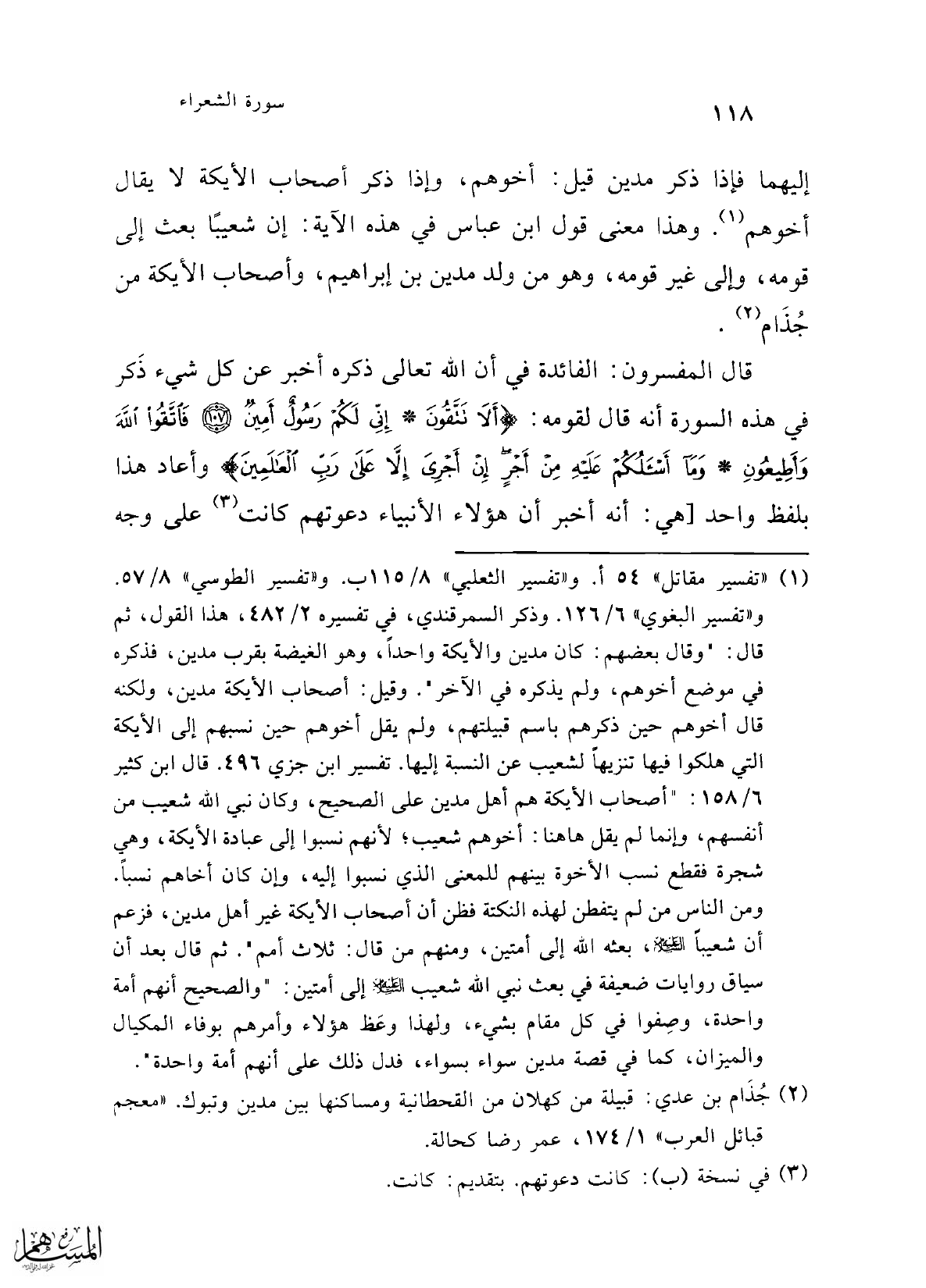 (¬1) "تفسير مقاتل" 54 أ. و"تفسير الثعلبي" 8/ 115 ب. و"تفسير الطوسي" 8/ 57. و"تفسير البغوي" 6/ 126. وذكر السمرقندي، في تفسيره 2/ 482، هذا القول، ثم قال: "وقال بعضهم: كان مدين والأيكة واحداً، وهو الغيضة بقرب مدين، فذكره في موضع أخوهم، ولم يذكره في الآخر". وقيل: أصحاب الأيكة مدين، ولكنه قال أخوهم حين ذكرهم باسم قبيلتهم، ولم يقل أخوهم حين نسبهم إلى الأيكة التي هلكوا فيها تنزيهاً لشعيب عن النسبة إليها. تفسير ابن جزي 496. قال ابن كثير 6/ 158: "أصحاب الأيكة هم أهل مدين على الصحيح، وكان نبي الله شعيب من أنفسهم، وإنما لم يقل هاهنا: أخوهم شعيب؛ لأنهم نسبوا إلى عبادة الأيكة، وهي شجرة فقطع نسب الأخوة بينهم للمعنى الذي نسبوا إليه، وإن كان أخاهم نسباً. ومن الناس من لم يتفطن لهذه النكتة فظن أن أصحاب الأيكة غير أهل مدين، فزعم أن شعيباً -عليه السلام-، بعثه الله إلى أمتين، ومنهم من قال: ثلاث أمم". ثم قال بعد أن سياق روايات ضعيفة في بعث نبي الله شعيب -عليه السلام- إلى أمتين: "والصحيح أنهم أمة واحدة، وصِفوا في كل مقام بشيء، ولهذا وعَظ هؤلاء وأمرهم بوفاء المكيال والميزان، كما في قصة مدين سواء بسواء، فدل ذلك على أنهم أمة واحدة".