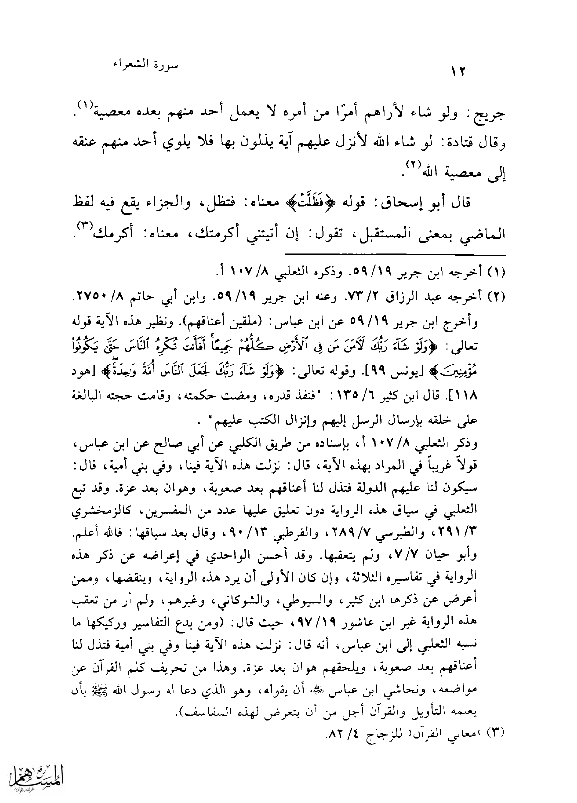 (¬2) أخرجه عبد الرزاق 2/ 73. وعنه ابن جرير 19/ 59. وابن أبي حاتم 8/ 2750. وأخرج ابن جرير 19/ 59 عن ابن عباس: (ملقين أعناقهم). ونظير هذه الآية قوله تعالى: {وَلَوْ شَاءَ رَبُّكَ لَآمَنَ مَنْ فِي الْأَرْضِ كُلُّهُمْ جَمِيعًا أَفَأَنْتَ تُكْرِهُ النَّاسَ حَتَّى يَكُونُوا مُؤْمِنِينَ} [يونس: 99]. وقوله تعالى: {وَلَوْ شَاءَ رَبُّكَ لَجَعَلَ النَّاسَ أُمَّةً وَاحِدَةً} [هود: 118]. قال ابن كثير 6/ 135: "فنفذ قدره، ومضت حكمته، وقامت حجته البالغة على خلقه بإرسال الرسل إليهم وإنزال الكتب عليهم".