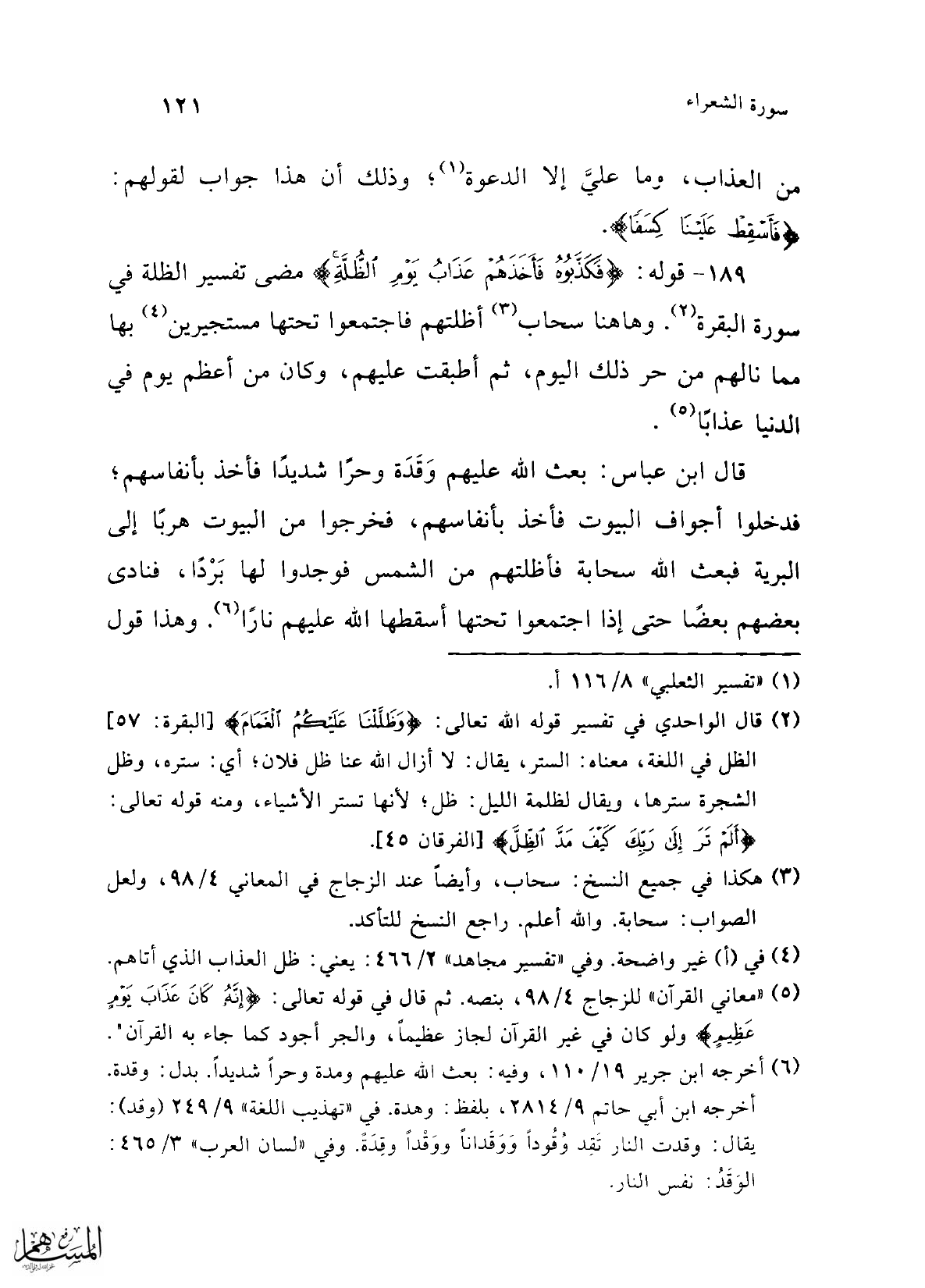 189 - قوله: {فَكَذَّبُوهُ فَأَخَذَهُمْ عَذَابُ يَوْمِ الظُّلَّة} مضى تفسير الظلة في سورة البقرة (¬2). وهاهنا سحاب (¬3) أظلتهم فاجتمعوا تحتها مستجيرين (¬4) بها مما نالهم من حر ذلك اليوم، ثم أطبقت عليهم، وكان من أعظم يوم في الدنيا عذابًا (¬5).