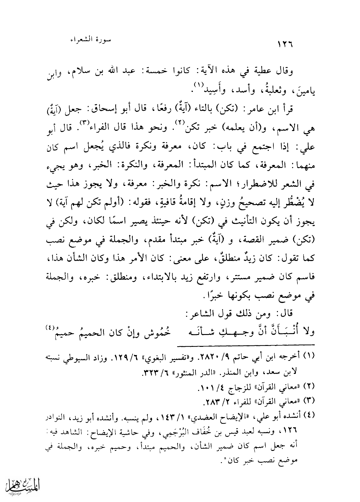 قرأ ابن عامر: (تكن) بالتاء (آيةٌ) رفعًا، قال أبو إسحاق: جعل (آيةٌ) هي الاسم، و (أن يعلمه) خبر تكن (¬2). ونحو هذا قال الفراء (¬3). قال أبو علي: إذا اجتمع في باب: كان، معرفة ونكرة فالذي يُجعل اسم كان منهما: المعرفة، كما كان المبتدأ: المعرفة، والنكرة: الخبر، وهو يجيء في الشعر للاضطرار؛ الاسم: نكرة والخبر: معرفة، ولا يجوز هذا حيث لا يُضْطُّر إليه تصحيحُ وزنٍ، ولا إقامةُ قافيةٍ، فقوله: (أولم تكن لهم آية) لا يجوز أن يكون التأنيث في (تكن) لأنه حينئذ يصير اسمًا لكان، ولكن في (تكن) ضمير القصة، و (آيةٌ) خبر مبتدأ مقدم، والجملة في موضع نصب كما تقول: كان زيدٌ منطلقٌ، على معنى: كان الأمر هذا وكان الشأن هذا، قاسم كان ضمير مستتر، وارتفع زيد بالابتداء، ومنطلق: خبره، والجملة في موضع نصب بكونها خبرًا.
