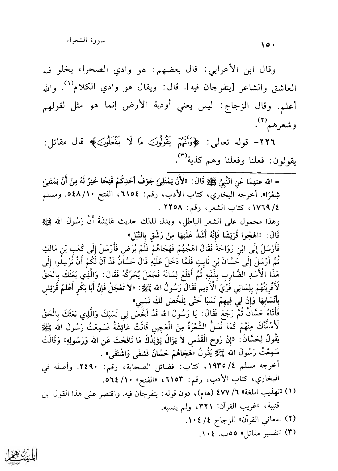 وهذا محمول على الشعر الباطل، ويدل لذلك حديث عَائِشَةَ أَن رَسُولَ الله -صلى الله عليه وسلم- قَالَ: "اهْجُوا قُرَيْشًا فَإِنَّهُ أَشَدُّ عَلَيْهَا مِنْ رَشْقٍ بِالنَّبْلِ" فَأَرْسَلَ إِلَى ابْنِ رَوَاحَةَ فَقَالَ اهْجُهُمْ فَهَجَاهُمْ فَلَمْ يُرْضِ فَأَرْسَلَ إِلَى كَعْبِ بْنِ مَالِكٍ ثُمِّ أَرْسَلَ إِلَى حَسَّانَ بْنٍ ثَابِتٍ فَلَمَّا دَخَلَ عَلَيْهِ قَالَ حَسَّانُ قَدْ آنَ لَكُمْ أَنْ تُرْسِلوا إِلَى هَذَا الْأَسَدِ الضَّارِب بِذنَبِهِ ثُمَّ أَدْلَعَ لِسَانَهُ فَجَعَلَ يُحَرِّكُهُ فَقَالَ: وَالَّذِي بَعَثَكَ بِالْحَق لَأَفْرِيَنَّهُمْ بِلِسَانِي فَرْيَ الْأَدِيمِ فَقَالَ رَسُولُ الله -صلى الله عليه وسلم-:"لاَ تَعْجَلْ فَإِنَ أَبَا بَكْرٍ أَعْلَمُ قُرَيْشٍ بِأَنَسَابِهَا وإِن لِي فِيهِمْ نَسَبًا حَتَّى يلَخِّصَ لَكَ نَسَبِي"