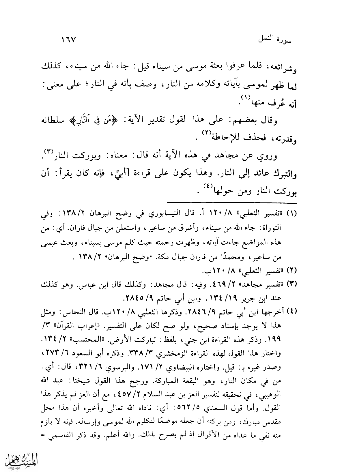 (¬4) أخرجها ابن أبي حاتم 9/ 2846. وذكرها الثعلبي 8/ 120 ب. قال النحاس: ومثل هذا لا يوجد بإسناد صحيح، ولو صح لكان على التفسير. "إعراب القرآن" 3/ 199. وذكر هذه القراءة ابن جني، بلفظ: تباركت الأرض. "المحتسب" 2/ 134. واختار هذا القول لهذه القراءة الزمخشري 3/ 338. وذكره أبو السعود 6/ 273، وصدر غيره بـ: قيل. واختاره البيضاوي 2/ 171. والبرسوي 6/ 321، قال: أي: من في مكان النار، وهو البقعة المباركة. ورجح هذا القول شيخنا: عبد الله الوهيبي، في تحقيقه لتفسير العز بن عبد السلام 2/ 457، مع أن العز لم يذكر هذا القول. وأما قول السعدي 5/ 562: أي: ناداه الله تعالى وأخبره أن هذا محل مقدس مبارك، ومن بركته أن جعله موضعًا لتكليم الله لموسى وإرساله. فإنه لا يلزم منه نفي ما عداه من الأقوال إذ لم يصرح بذلك. والله أعلم. وقد ذكر القاسمي =