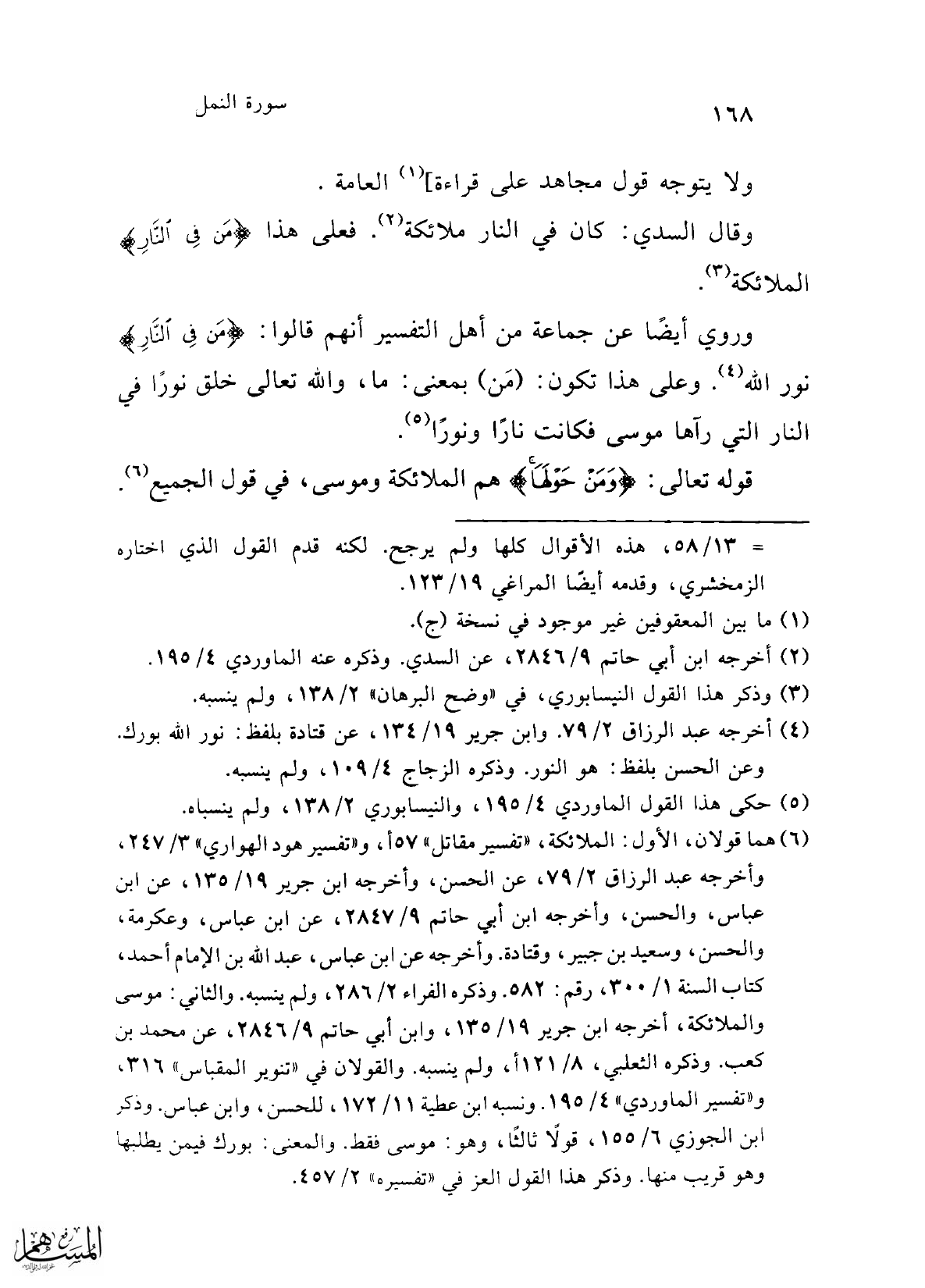وروي أيضًا عن جماعة من أهل التفسير أنهم قالوا: {مَنْ فِي النَّارِ} نور الله (¬4). وعلى هذا تكون: (مَن) بمعنى: ما، والله تعالى خلق نورًا في النار التي رآها موسى فكانت نارًا ونورًا (¬5).