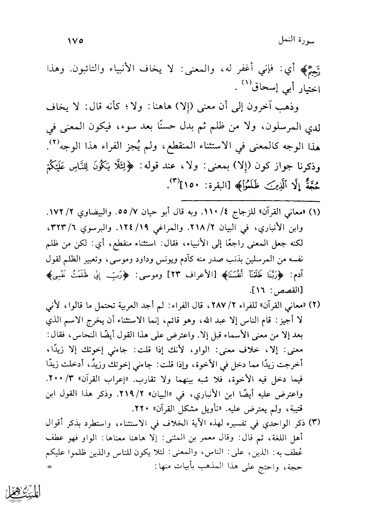 (¬2) "معاني القرآن" للفراء 2/ 287، قال الفراء: لم أجد العربية تحتمل ما قالوا، لأني لا أجيز: قام الناس إلا عبد الله، وهو قائم، إنما الاستثناء أن يخرج الاسم الذي بعد إلا من معنى الأسماء قبل إلا. واعترض على هذا القول أيضًا النحاس، فقال: معنى: إلا، خلاف معنى: الواو، لأنك إذا قلت: جاءني إخوتك إلا زيدًا، أخرجت زيدًا مما دخل في الأخوة، وإذا قلت: جاءني إخوتك وزيدٌ، أدخلت زيدًا فيما دخل فيه الأخوة، فلا شبه بينهما ولا تقارب. "إعراب القرآن" 3/ 200. واعترض عليه أيضًا ابن الأنباري، في "البيان" 2/ 219. وذكر هذا القول ابن قتيبة، ولم يعترض عليه. "تأويل مشكل القرآن" 220.