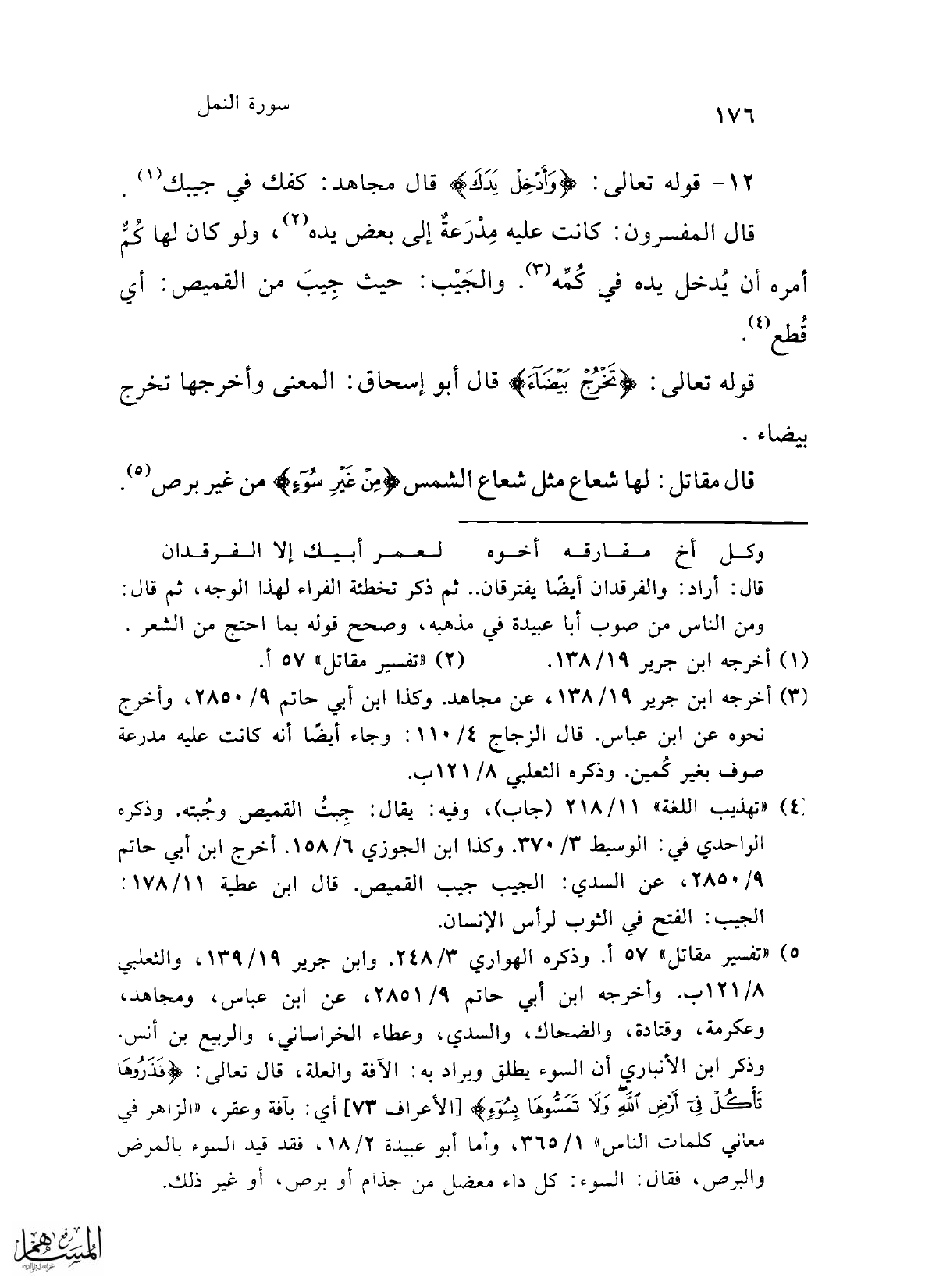 12 - قوله تعالى: {وَأَدْخِلْ يَدَكَ} قال مجاهد: كفك في جيبك (¬1).