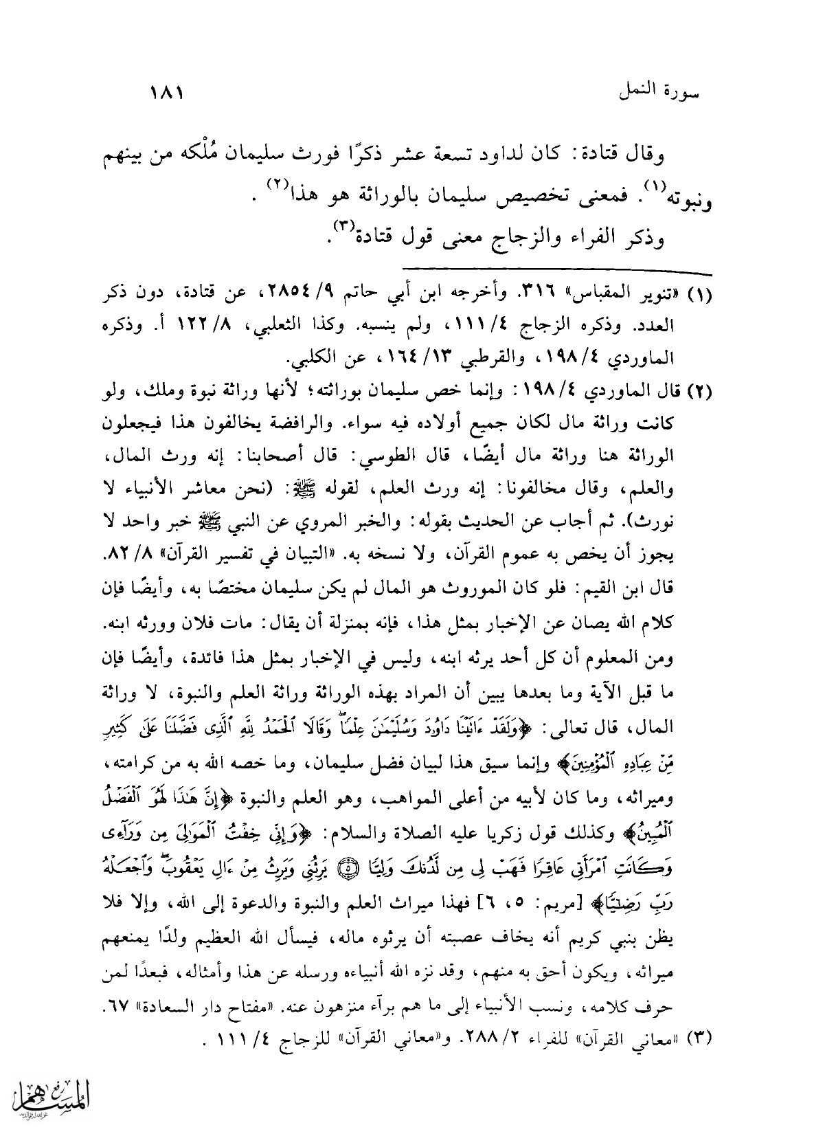 (¬2) قال الماوردي 4/ 198: وإنما خص سليمان بوراثته؛ لأنها وراثة نبوة وملك، ولو كانت وراثة مال لكان جميع أولاده فيه سواء. والرافضة يخالفون هذا فيجعلون الوراثة هنا وراثة مال أيضًا، قال الطوسي: قال أصحابنا: إنه ورث المال، والعلم، وقال مخالفونا: إنه ورث العلم، لقوله -صلى الله عليه وسلم -: (نحن معاشر الأنبياء لا نورث). ثم أجاب عن الحديث بقوله: والخبر المروي عن النبي -صلى الله عليه وسلم - خبر واحد لا يجوز أن يخص به عموم القرآن، ولا نسخه به."التبيان في تفسير القرآن" 8/ 82. قال ابن القيم: فلو كان الموروث هو المال لم يكن سليمان مختصًا به، وأيضًا فإن كلام الله يصان عن الإخبار بمثل هذا، فإنه بمنزلة أن يقال: مات فلان وورثه ابنه. ومن المعلوم أن كل أحد يرثه ابنه، وليس في الإخبار بمثل هذا فائدة، وأيضًا فإن ما قبل الآية وما بعدها يبين أن المراد بهذه الوراثة ورائة العلم والنبوة، لا وراثة المال، قال تعالى: {وَلَقَدْ آتَيْنَا دَاوُودَ وَسُلَيْمَانَ عِلْمًا وَقَالَا الْحَمْدُ لِلَّهِ الَّذِي فَضَّلَنَا عَلَى كَثِيرٍ مِنْ عِبَادِهِ الْمُؤْمِنِينَ} وإنما سيق هذا لبيان فضل سليمان، وما خصه الله به من كرامته، وميراثه، وما كان لأبيه من أعلى المواهب، وهو العلم والنبوة {إِنَّ هَذَا لَهُوَ الْفَضْلُ الْمُبِينُ} وكذلك قول زكريا عليه الصلاة والسلام: {وإِنِّي خِفْتُ الْمَوَالِيَ مِنْ وَرَائِي وَكَانَتِ امْرَأَتِي عَاقِرًا فَهَبْ لِي مِنْ لَدُنْكَ وَلِيًّا (5) يَرِثُنِي وَيَرِثُ مِنْ آلِ يَعْقُوبَ وَاجْعَلْهُ رَبِّ رَضِيًّا} [مريم: 5، 6] فهذا ميراث العلم والنبوة والدعوة إلى الله، وإلا فلا يظن بنبي كريم أنه يخاف عصبته أن يرثوه ماله، فيسأل الله العظيم ولدًا يمنعهم ميراثه، ويكون أحق به منهم، وقد نزه الله أنبياءه ورسله عن هذا وأمثاله، فبعداً لمن حرف كلامه، ونسب الأنبياء إلى ما هم برآء منزهون عنه. "مفتاح دار السعادة" 67.