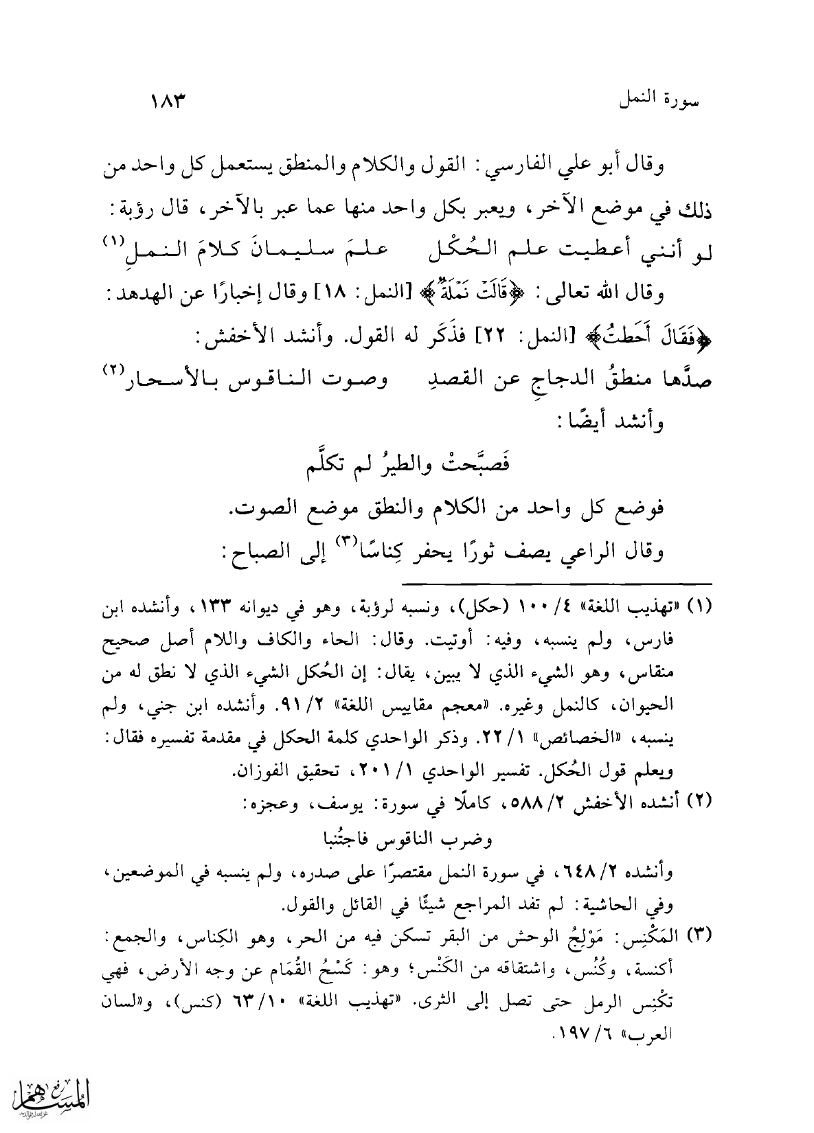 (¬1) "تهذيب اللغة" 4/ 100 (حكل)، ونسبه لرؤبة، وهو في ديوانه 133، وأنشده ابن فارس، ولم ينسبه، وفيه: أوتيت. وقال: الحاء والكاف واللام أصل صحيح منقاس، وهو الشيء الذي لا يبين، يقال: إن الحُكل الشيء الذي لا نطق له من الحيوان، كالنمل وغيره. "معجم مقاييس اللغة" 2/ 91. وأنشده ابن جني، ولم ينسبه، "الخصائص" 1/ 22. وذكر الواحدي كلمة الحكل في مقدمة تفسيره فقال: ويعلم قول الحُكل. تفسير الواحدي 1/ 201، تحقيق الفوزان.