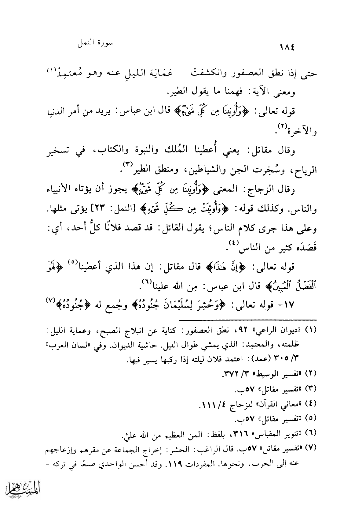وقال مقاتل: يعني أُعطينا المُلك والنبوة والكتاب، في تسخير الرياح، وسُخِرت الجن والشياطين، ومنطق الطير (¬3).