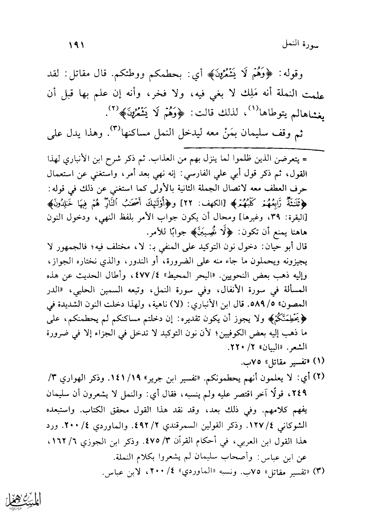 قال أبو حيان: دخول نون التوكيد على المنفي بـ: لا، مختلف فيه؛ فالجمهور لا يجيزونه ويحملون ما جاء منه على الضرورة، أو الندور، والذي نختاره الجواز، وإليه ذهب بعض النحويين. "البحر المحيط" 4/ 477، وأطال الحديث عن هذه المسألة في سورة الأنفال، وفي سورة النمل، وتبعه السمين الحلبي، "الدر المصون" 5/ 589. قال ابن الأنباري: (لا) ناهية، ولهذا دخلت النون الشديدة في {يَحْطِمَنَّكُمْ} ولا يجوز أن يكون تقديره: إن دخلتم مساكنكم لم يحطمنكم، على ما ذهب إليه بعض الكوفيين؛ لأن نون التوكيد لا تدخل في الجزاء إلا في ضرورة الشعر. "البيان" 2/ 220.