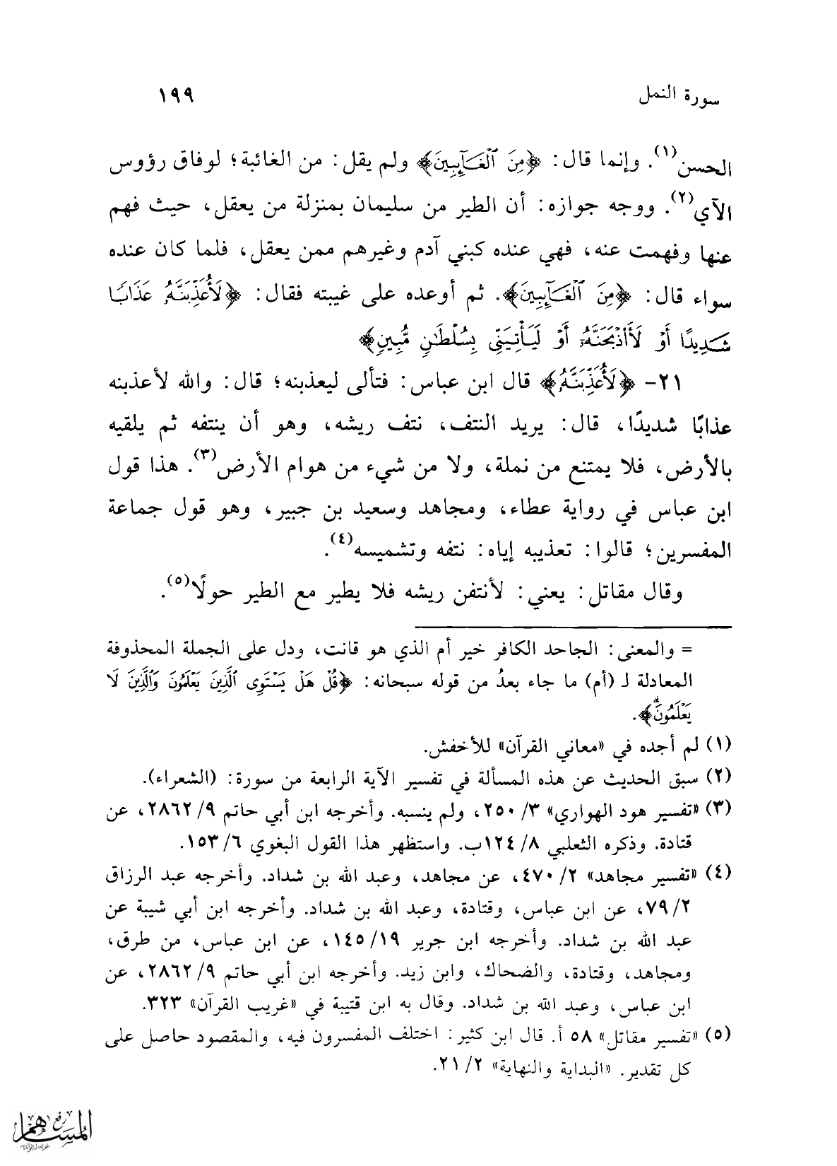 21 - {لَأُعَذِّبَنَّهُ} قال ابن عباس: فتألى ليعذبنه؛ قال: والله لأعذبنه عذاباً شديدًا، قال: يريد النتف، نتف ريشه، وهو أن ينتفه ثم يلقيه بالأرض، فلا يمتنع من نملة، ولا من شيء من هوام الأرض (¬3). هذا قول ابن عباس في رواية عطاء، ومجاهد وسعيد بن جبير، وهو قول جماعة المفسرين؛ قالوا: تعذيبه إياه: نتفه وتشميسه (¬4).