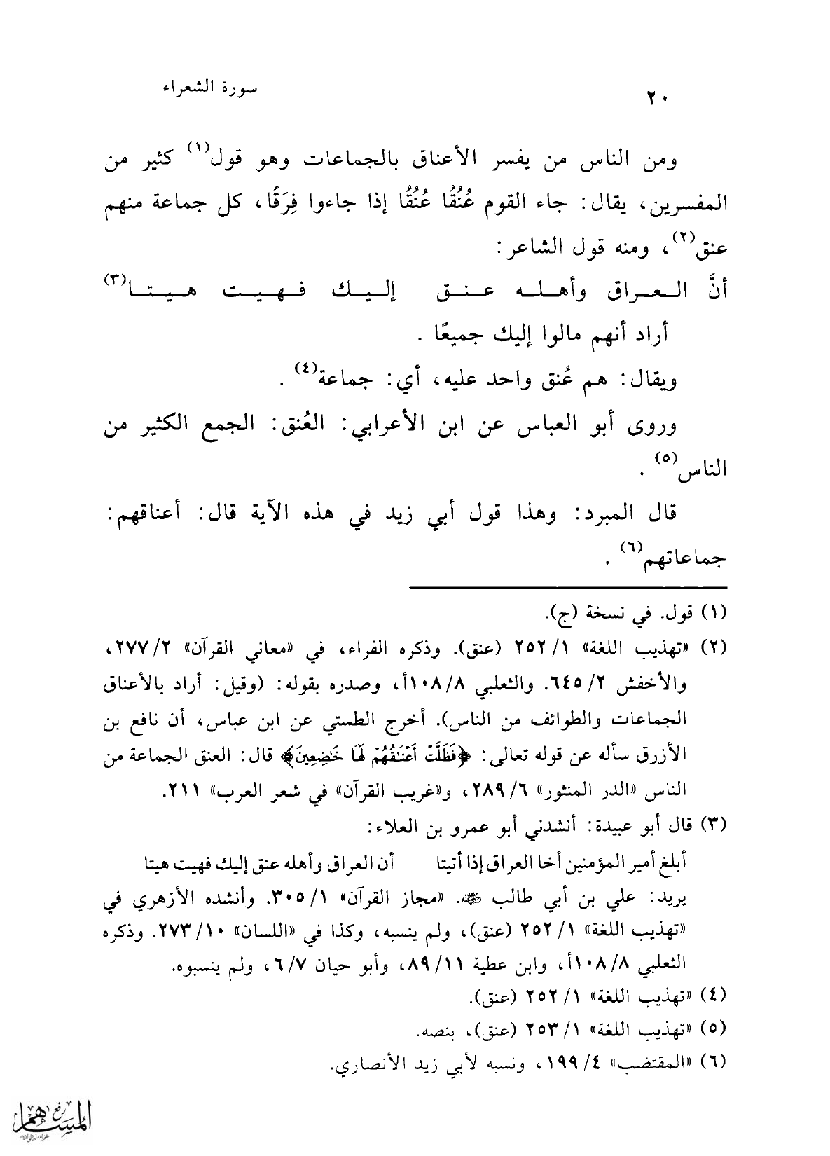 (¬2) "تهذيب اللغة" 1/ 252 (عنق). وذكره الفراء، في "معاني القرآن" 2/ 277، والأخفش 2/ 645. والثعلبي 8/ 108 أ، وصدره بقوله: (وقيل: أراد بالأعناق الجماعات والطوائف من الناس). أخرج الطستي عن ابن عباس، أن نافع بن الأزرق سأله عن قوله تعالى: {فَظَلَّتْ أَعْنَاقُهُمْ لَهَا خَاضِعِينَ} قال: العنق الجماعة من الناس "الدر المنثور" 6/ 289، و"غريب القرآن" في شعر العرب 211.