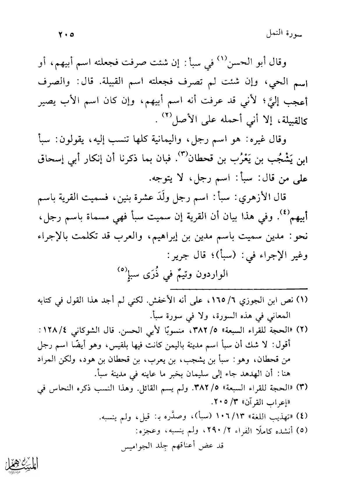 (¬2) "الحجة للقراء السبعة" 5/ 382، منسوبًا لأبي الحسن. قال الشوكاني 4/ 128: أقول: لا شك أن سبأ اسم مدينة باليمن كانت فيها بلقيس، وهو أيضًا اسم رجل من قحطان، وهو: سبأ بن يشجب، بن يعرب، بن قحطان بن هود، ولكن المراد هنا: أن الهدهد جاء إلى سليمان بخبر ما عاينه في مدينة سبأ.