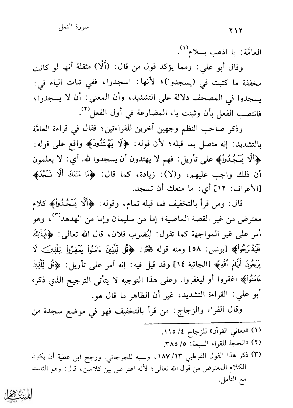 وقال أبو علي: ومما يؤكد قول من قال: (أَلَّا) مثقلة أنها لو كانت مخففة ما كتبت في (يسجدوا)؛ لأنها: اسجدوا، ففي ثبات الياء في: يسجدوا في المصحف دلالة على التشديد، وأن المعنى: أن لا يسجدوا؛ فانتصب الفعل بأن وثبتت ياء المضارعة في أول الفعل (¬2).