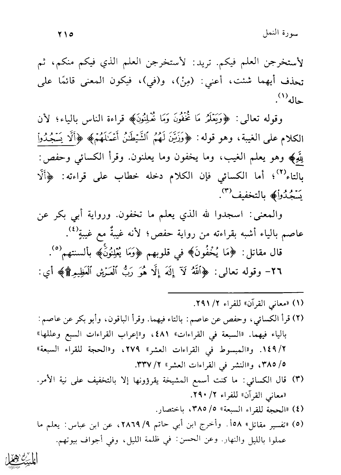 والمعنى: اسجدوا لله الذي يعلم ما تخفون. ورواية أبي بكر عن عاصم بالياء أشبه بقراءته من رواية حفص؛ لأنه غيبةٌ مع غيبةٍ (¬4).