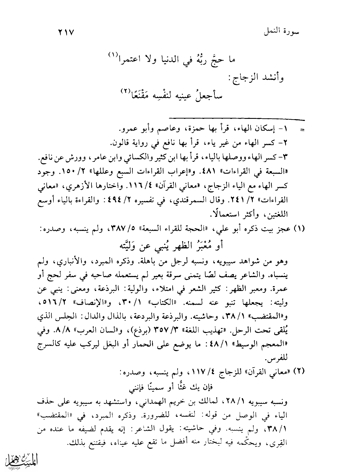 (¬1) عجز بيت ذكره أبو علي، "الحجة للقراء السبعة" 5/ 387، ولم ينسبه، وصدره: