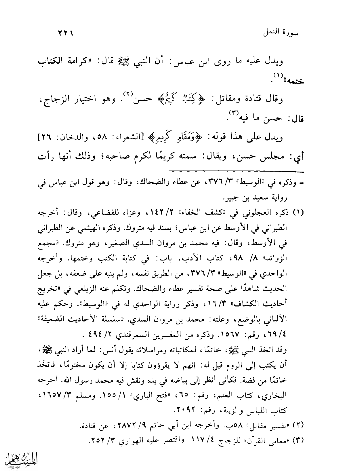 (¬1) ذكره العجلوني في "كشف الخفاء" 2/ 142، وعزاه للقضاعي، وقال: أخرجه الطبراني في الأوسط عن ابن عباس؛ بسند فيه متروك. وذكره الهيثمي عن الطبراني في الأوسط، وقال: فيه محمد بن مروان السدي الصغير، وهو متروك. "مجمع الزوائد" 8/ 98، كتاب الأدب، باب: في كتابة الكتب وختمها. وأخرجه الواحدي في "الوسيط" 3/ 376، من الطريق نفسه، ولم ينبه على ضعفه، بل جعل الحديث شاهدًا على صحة تفسير عطاء والضحاك. وتكلم عنه الزيلعي في "تخريج أحاديث الكشاف" 3/ 16، وذكر رواية الواحدي له في "الوسيط". وحكم عليه الألباني بالوضع، وعلته: محمد بن مروان السدي. "سلسلة الأحاديث الضعيفة" 4/ 69، رقم: 1567. وذكره من المفسرين السمرقندي 2/ 494.