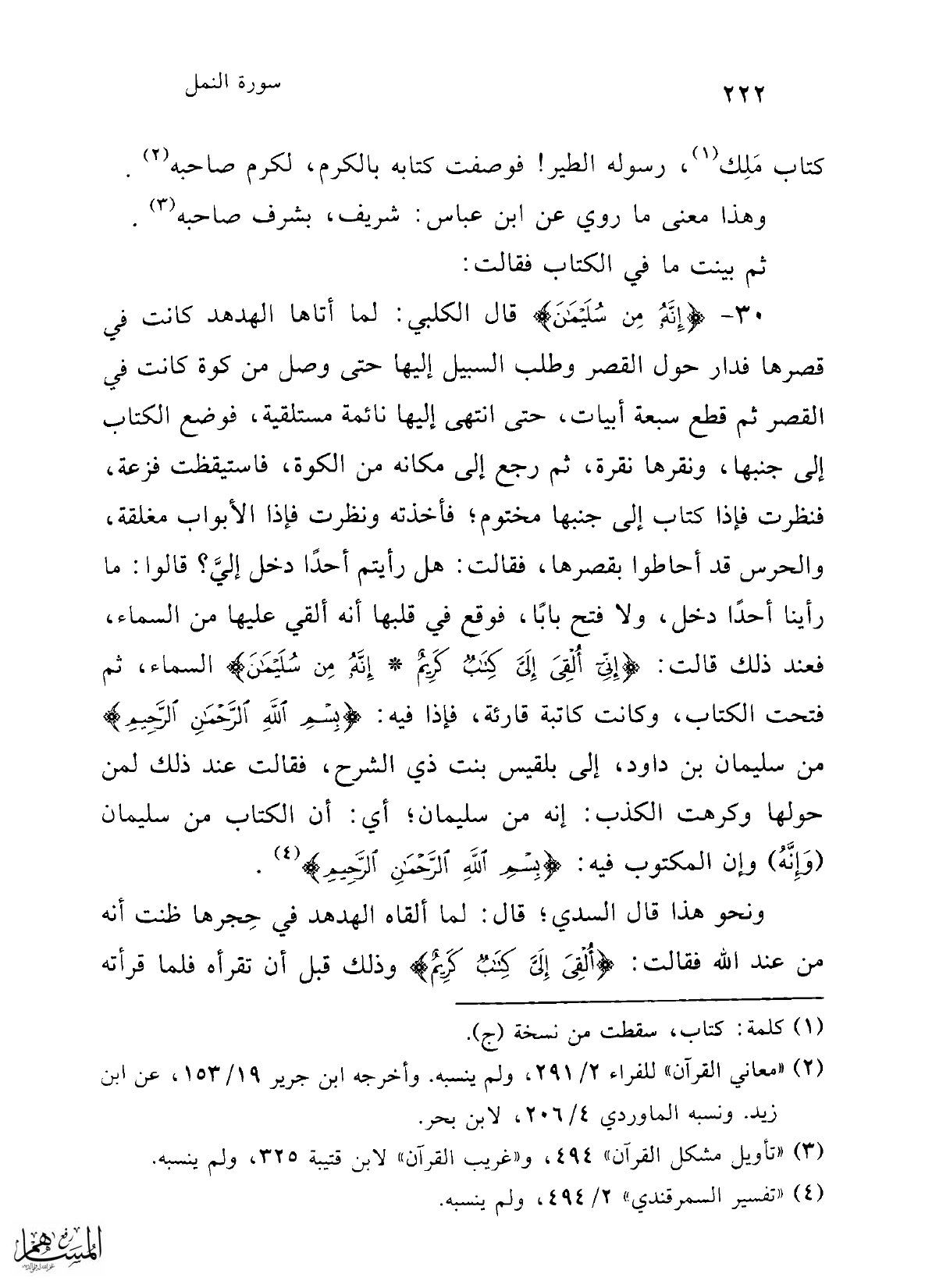 30 - {إِنَّهُ مِنْ سُلَيْمَانَ} قال الكلبي: لما أتاها الهدهد كانت في قصرها فدار حول القصر وطلب السبيل إليها حتى وصل من كوة كانت في القصر ثم قطع سبعة أبيات، حتى انتهى إليها نائمة مستلقية، فوضع الكتاب إلى جنبها، ونقرها نقرة، ثم رجع إلى مكانه من الكوة، فاستيقظت فزعة، فنظرت فإذا كتاب إلى جنبها مختوم؛ فأخذته ونظرت فإذا الأبواب مغلقة، والحرس قد أحاطوا بقصرها، فقالت: هل رأيتم أحدًا دخل إليَّ؟ قالوا: ما رأينا أحدًا دخل، ولا فتح بابًا، فوقع في قلبها أنه ألقي عليها من السماء، فعند ذلك قالت: {إِنِّي أُلْقِيَ إِلَيَّ كِتَابٌ كَرِيمٌ (29) إِنَّهُ مِنْ سُلَيْمَانَ} السماء، ثم فتحت الكتاب، وكانت كاتبة قارئة، فإذا فيه: {بِسْمِ اللَّهِ الرَّحْمَنِ الرَّحِيمِ} من سليمان بن داود، إلى بلقيس بنت ذي الشرح، فقالت عند ذلك لمن حولها وكرهت الكذب: إنه من سليمان؛ أي: أن الكتاب من سليمان (وَإِنَّهُ) وإن المكتوب فيه: {بِسْمِ اللَّهِ الرَّحْمَنِ الرَّحِيمِ} (¬4).