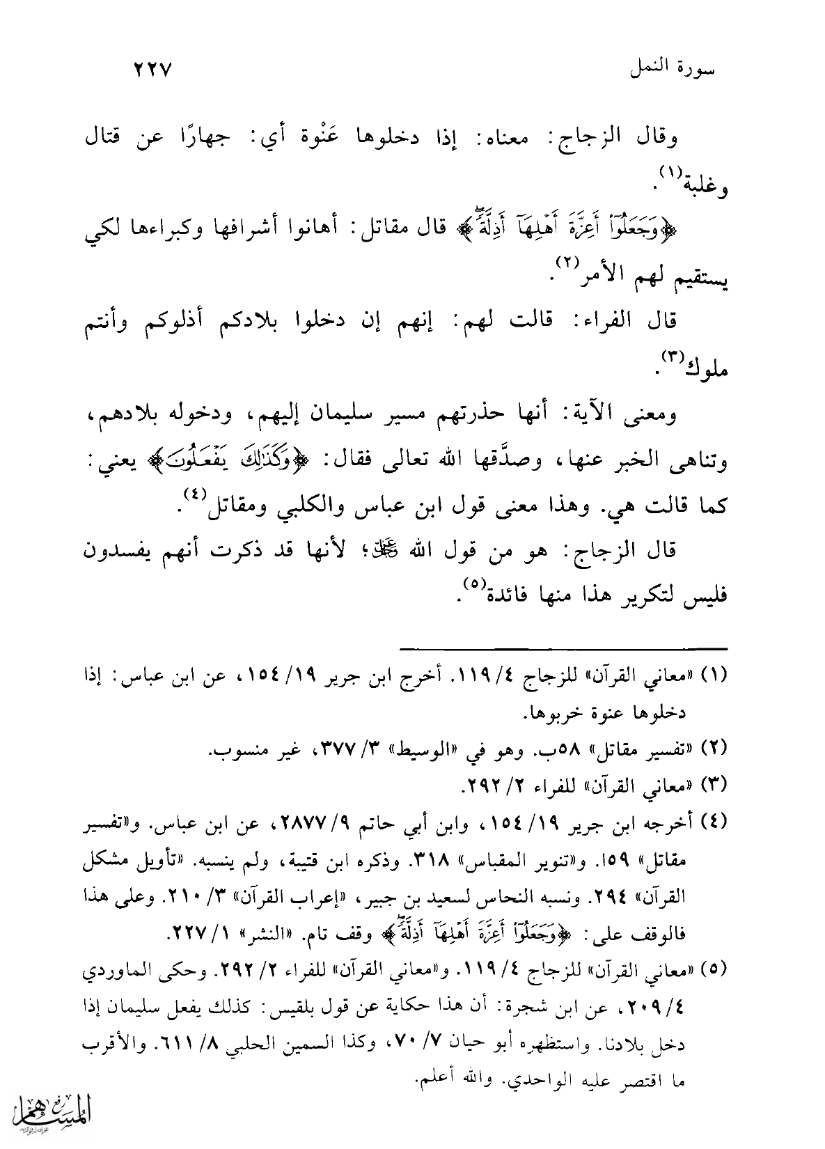 (¬5) "معاني القرآن" للزجاج 4/ 119. و"معاني القرآن" للفراء 2/ 292. وحكى الماوردي 4/ 209، عن ابن شجرة: أن هذا حكايته عن قول بلقيس: كذلك يفعل سليمان إذا دخل بلادنا. واستظهره أبو حيان 7/ 70، وكذا السمين الحلبي 8/ 611. والأقرب ما اقتصر عليه الواحدي. والله أعلم.