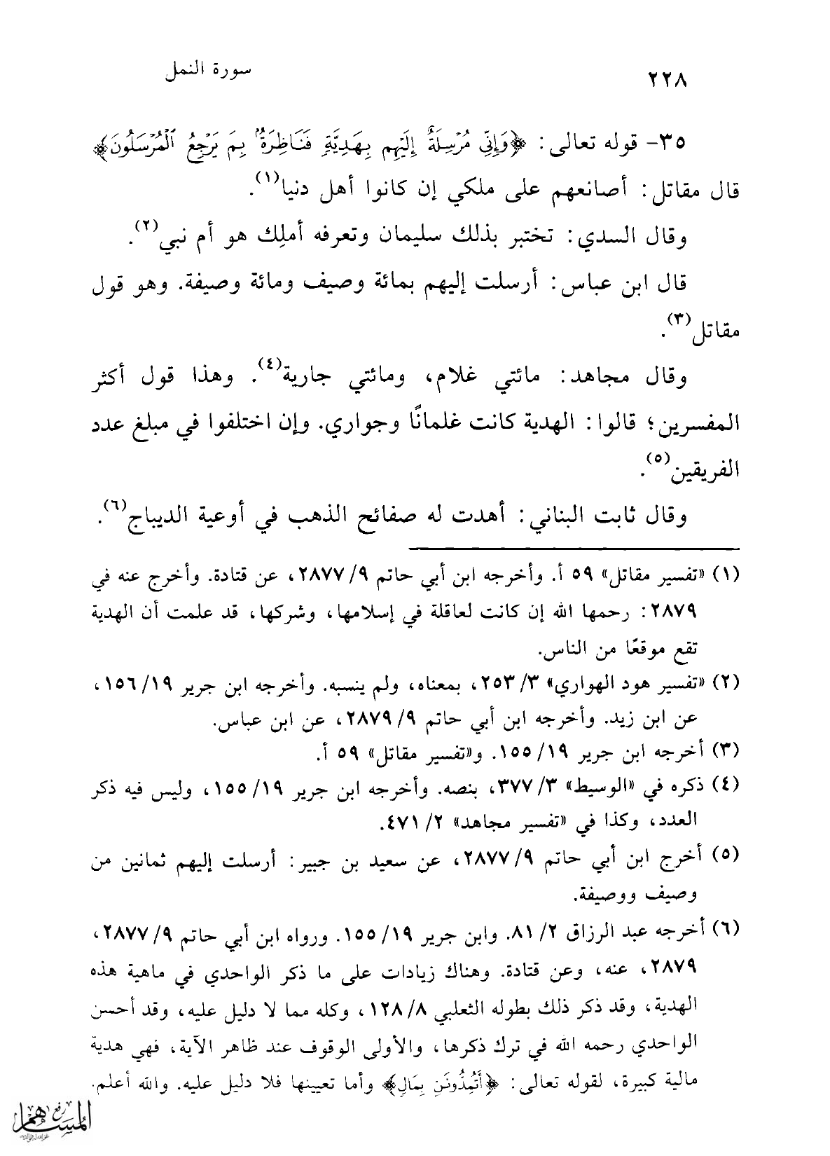 (¬6) أخرجه عبد الرزاق 2/ 81. وابن جرير 19/ 155. ورواه ابن أبي حاتم 9/ 2877، 2879، عنه، وعن قتادة. وهناك زيادات على ما ذكر الواحدي في ماهية هذه الهدية، وقد ذكر ذلك بطوله الثعلبي 8/ 128، وكله مما لا دليل عليه، وقد أحسن الواحدي رحمه الله في ترك ذكرها، والأولى الوقوف عند ظاهر الآية، فهي هدية مالية كبيرة، لقوله تعالى: {أَتُمِدُّونَنِ بِمَالٍ} وأما تعيينها فلا دليل عليه. والله أعلم.