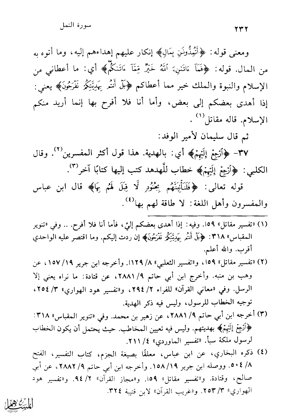 37 - {ارْجِعْ إِلَيْهِمْ} أي: بالهدية. هذا قول أكثر المفسرين (¬2). وقال الكلبي: {ارْجِعْ إِلَيْهِمْ} خطاب للَّهدهد كتب إليها كتابًا آخر (¬3).