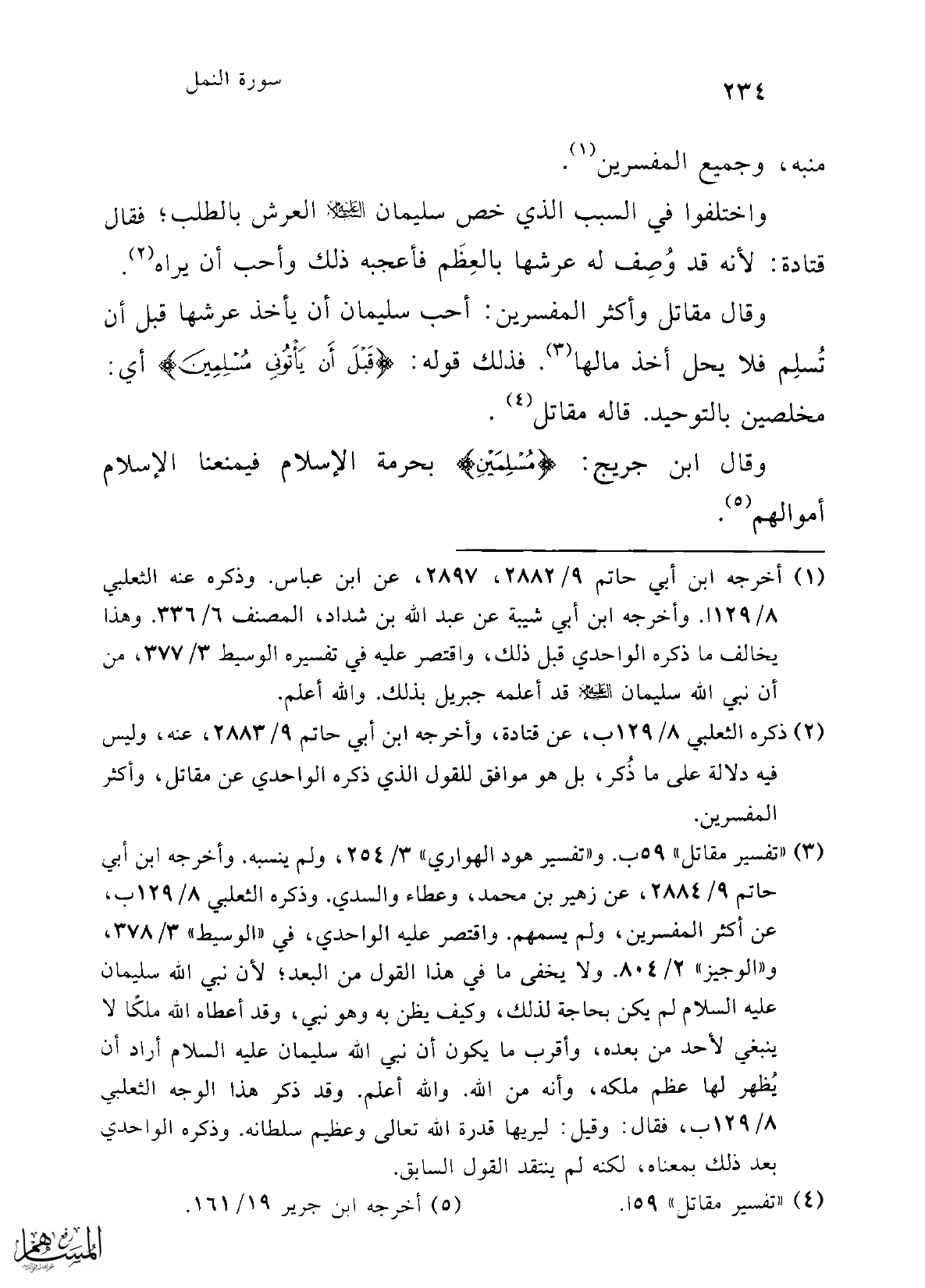 وقال مقاتل وأكثر المفسرين: أحب سليمان أن يأخذ عرشها قبل أن تُسلِم فلا يحل أخذ مالها (¬3). فذلك قوله: {قَبْلَ أَنْ يَأْتُونِي مُسْلِمِينَ} أي: مخلصين بالتوحيد. قاله مقاتل (¬4).