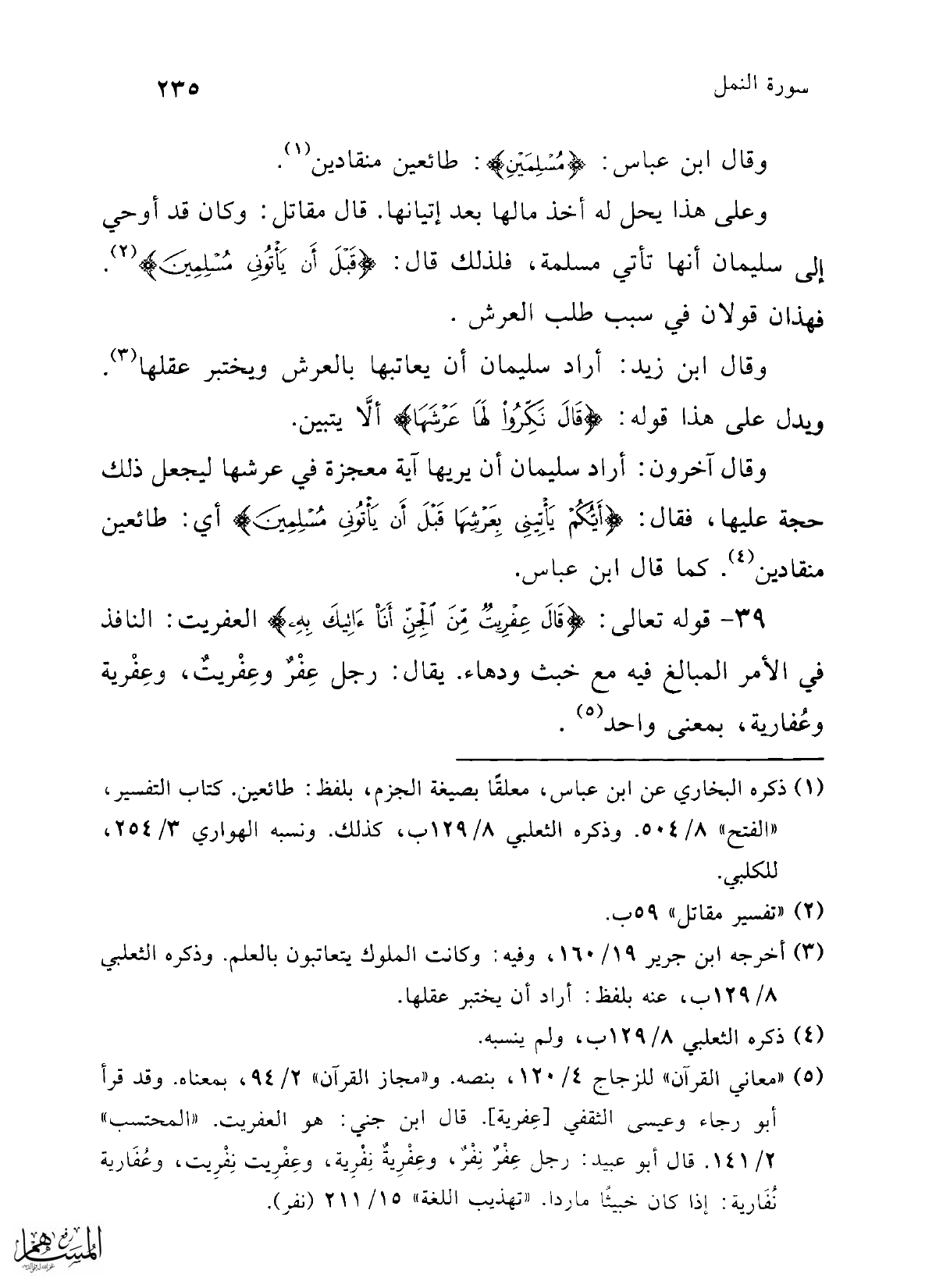 (¬5) "معاني القرآن" للزجاج 4/ 120، بنصه. و"مجاز القرآن" 2/ 94، بمعناه. وقد قرأ أبو رجاء وعيسى الثقفي [عِفرية]. قال ابن جني: هو العفريت. "المحتسب" 2/ 141. قال أبو عبيد: رجك عِفرٌ نِفرٌ، وعِفْرِيةٌ نِفْرِية، وعِفْرِيت نِفْرِيت، وعُفَارية نُفَارية: إذا كات خبثًا ماردا. "تهذيب اللغة" 15/ 211 (نفر).