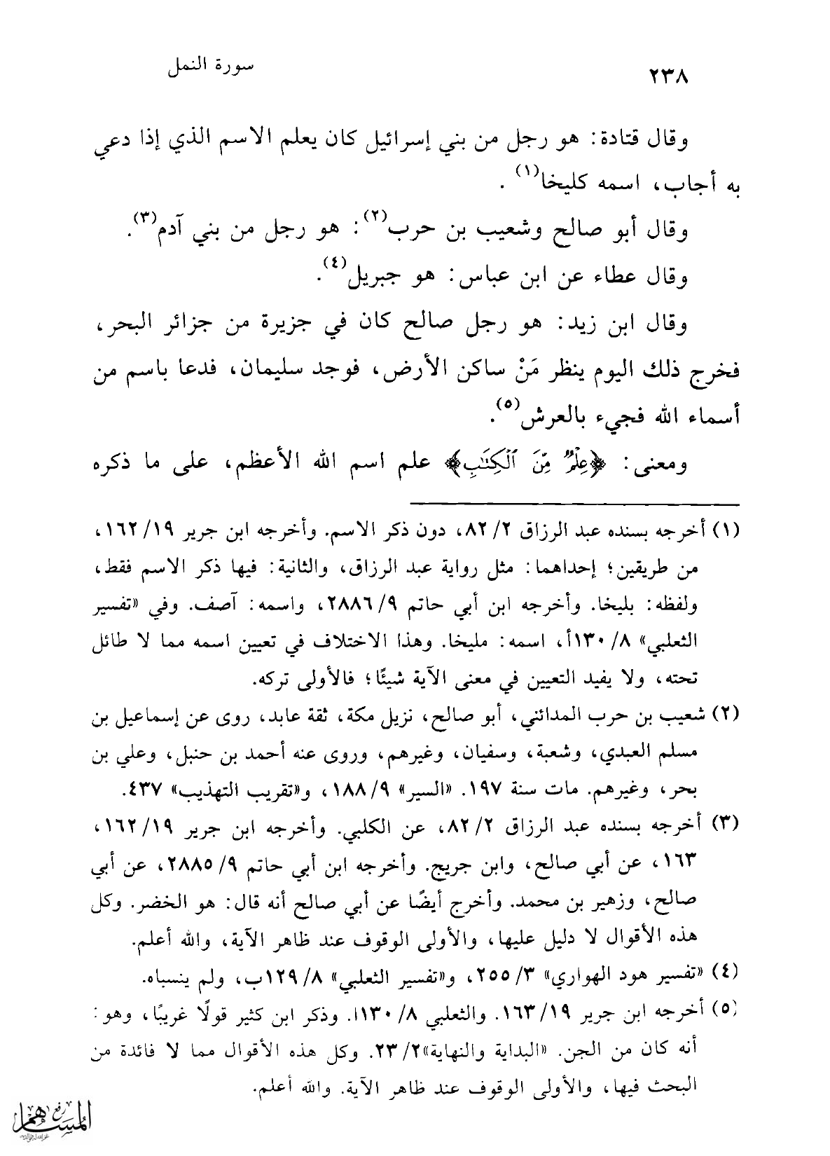 (¬5) أخرجه ابن جرير 19/ 163. والثعلبي 8/ 1130. وذكر ابن كثير قولاً غريبًا، وهو. أنه كان من الجن. "البداية والنهاية" 2/ 23. وكل هذه الأقوال مما لا فائدة من البحث فيها، والأولى الوقوف عند ظاهر الآية. والله أعلم.