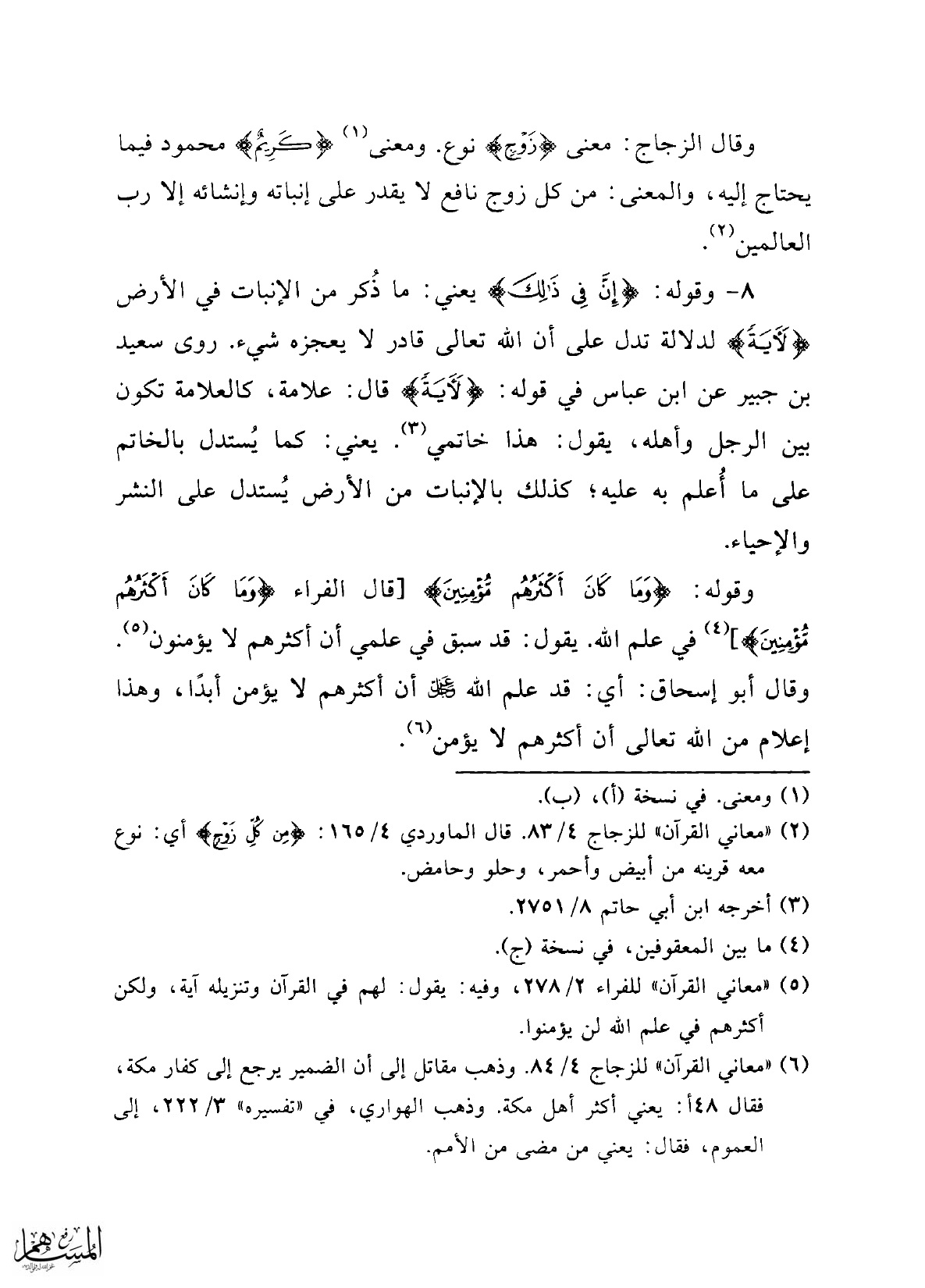 وقوله: {وَمَا كَانَ أَكْثَرُهُمْ مُؤْمِنِينَ} [قال الفراء {وَمَا كَانَ أَكْثَرُهُمْ مُؤْمِنِينَ}] (¬4) في علم الله. يقول: قد سبق في علمي أن أكثرهم لا يؤمنون (¬5). وقال أبو إسحاق: أي: قد علم الله عز وجل أن أكثرهم لا يؤمن أبدًا، وهذا إعلام من الله تعالى أن أكثرهم لا يؤمن (¬6).