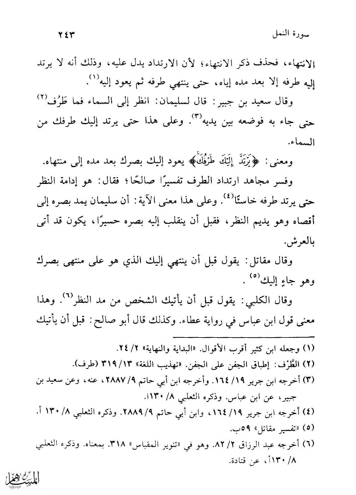 وفسر مجاهد ارتداد الطرف تفسيرًا صالحًا؛ فقال: هو إدامة النظر حتى يرتد طرفه خاسئًا (¬4). وعلى هذا معنى الآية: أن سليمان يمد بصره إلى أقصاه وهو يديم النظر، فقبل أن ينقلب إليه بصره حسيرًا، يكون قد أتى بالعرش.