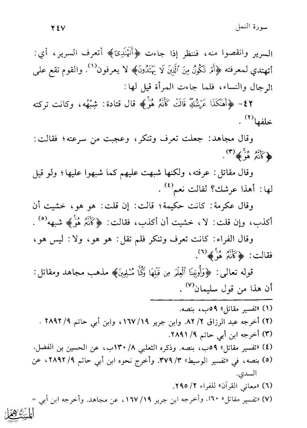 42 - {أَهَكَذَا عَرْشُكِ قَالَتْ كَأَنَّهُ هُوَ} قال قتادة: شِبْهُه، وكانت تركته خلفها (¬2).