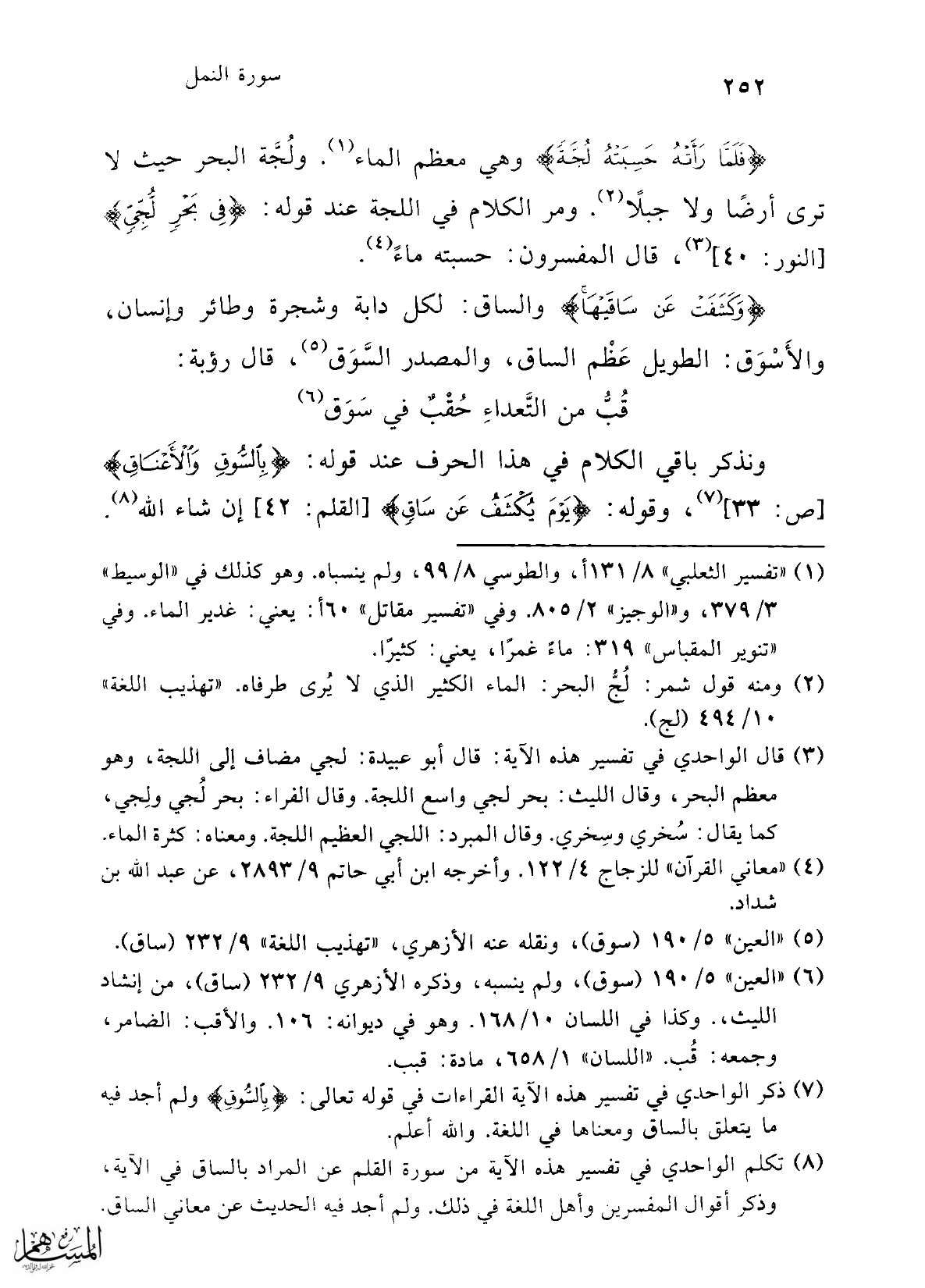(¬7) ذكر الواحدي في تفسير هذه الآية القراءات في قوله تعالى: {بِالسُّوقِ} ولم أجد فيه ما يتعلق بالساق ومعناها في اللغة. والله أعلم.
