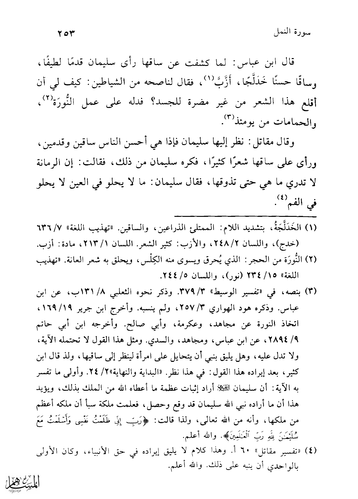 (¬3) بنصه، في "تفسير الوسيط" 3/ 379. وذكر نحوه الثعلبي 8/ 131 ب، عن ابن عباس. وذكره هود الهواري 3/ 257، ولم ينسبه. وأخرج ابن جرير 19/ 169، اتخاذ النورة عن مجاهد، وعكرمة، وأبي صالح. وأخرجه ابن أبي حاتم 9/ 2894، عن ابن عباس، ومجاهد، والسدي. ومثل هذا القول لا تحتمله الآية، ولا تدل عليه، وهل يليق بنبي أن يتحايل على امرأة لينظر إلى ساقيها، ولذ قال ابن كثير، بعد إيراده هذا القول: في هذا نظر. "البداية والنهاية" 2/ 24. وأولى ما تفسر به الآية: أن سليمان عليه السلام أراد إثبات عظمة ما أعطاه الله من الملك بذلك، ويؤيد هذا أن ما أراده نبي الله سليمان قد وقع وحصل، فعلمت ملكة سبأ أن ملكه أعظم من ملكها، وأنه من الله تعالى، ولذا قالت: {رَبِّ إِنِّي ظَلَمْتُ نَفْسِي وَأَسْلَمْتُ مَعَ سُلَيْمَانَ لِلَّهِ رَبِّ الْعَالَمِينَ}. والله أعلم.