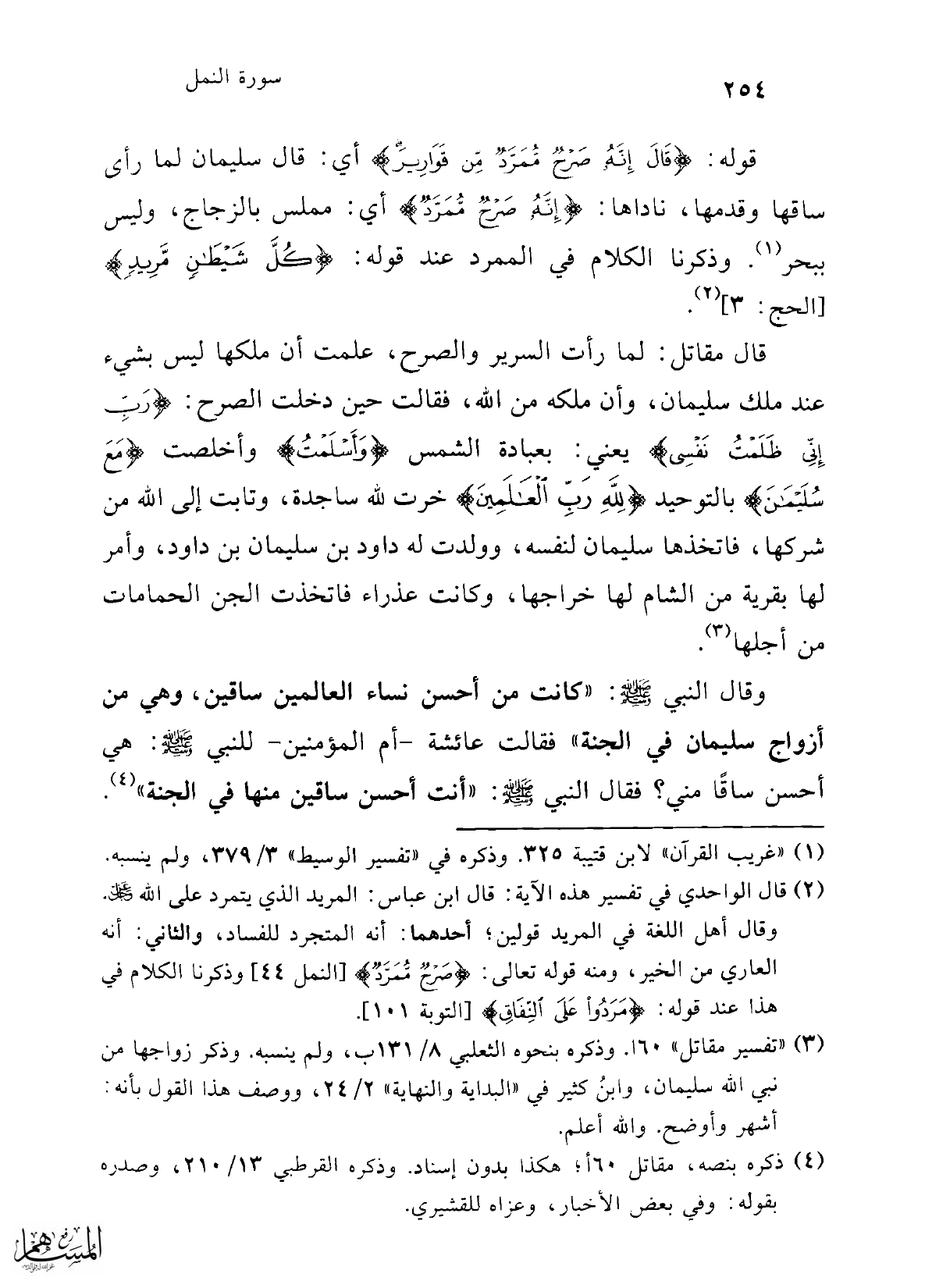 قوله: {قَالَ إِنَّهُ صَرْحٌ مُمَرَّدٌ مِنْ قَوَارِيرَ} أي: قال سليمان لما رأى ساقها وقدمها، ناداها: {إِنَّهُ صَرْحٌ مُمَرَّدٌ} أي: مملس بالزجاج، وليس ببحر (¬1). وذكرنا الكلام في الممرد عند قوله: {كُلَّ شَيْطَانٍ مَرِيدٍ} [الحج: 3] (¬2).