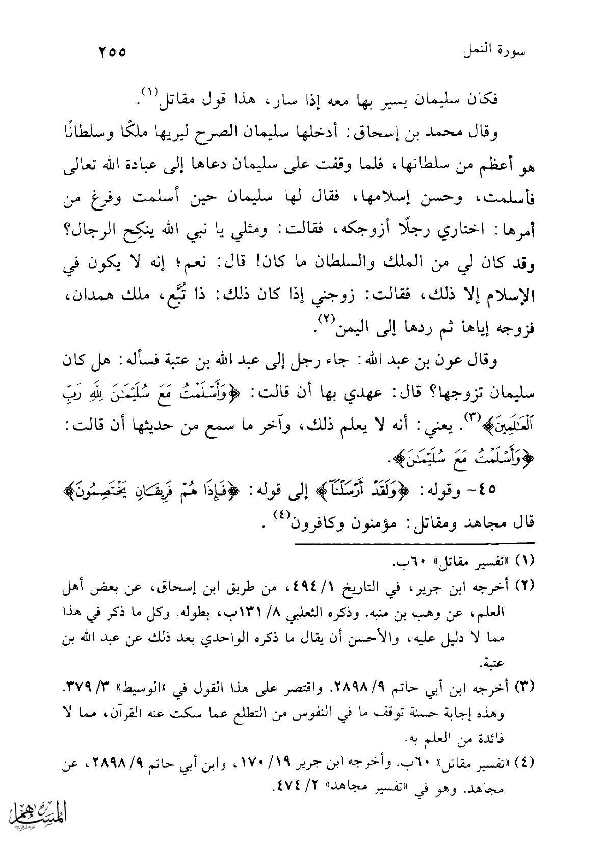 وقال عون بن عبد الله: جاء رجل إلى عبد الله بن عتبة فسأله: هل كان سليمان تزوجها؟ قال: عهدي بها أن قالت: {وَأَسْلَمْتُ مَعَ سُلَيْمَانَ لِلَّهِ رَبِّ الْعَالَمِينَ} (¬3). يعني: أنه لا يعلم ذلك، وآخر ما سمع من حديثها أن قالت: {وَأَسْلَمْتُ مَعَ سُلَيْمَانَ}.