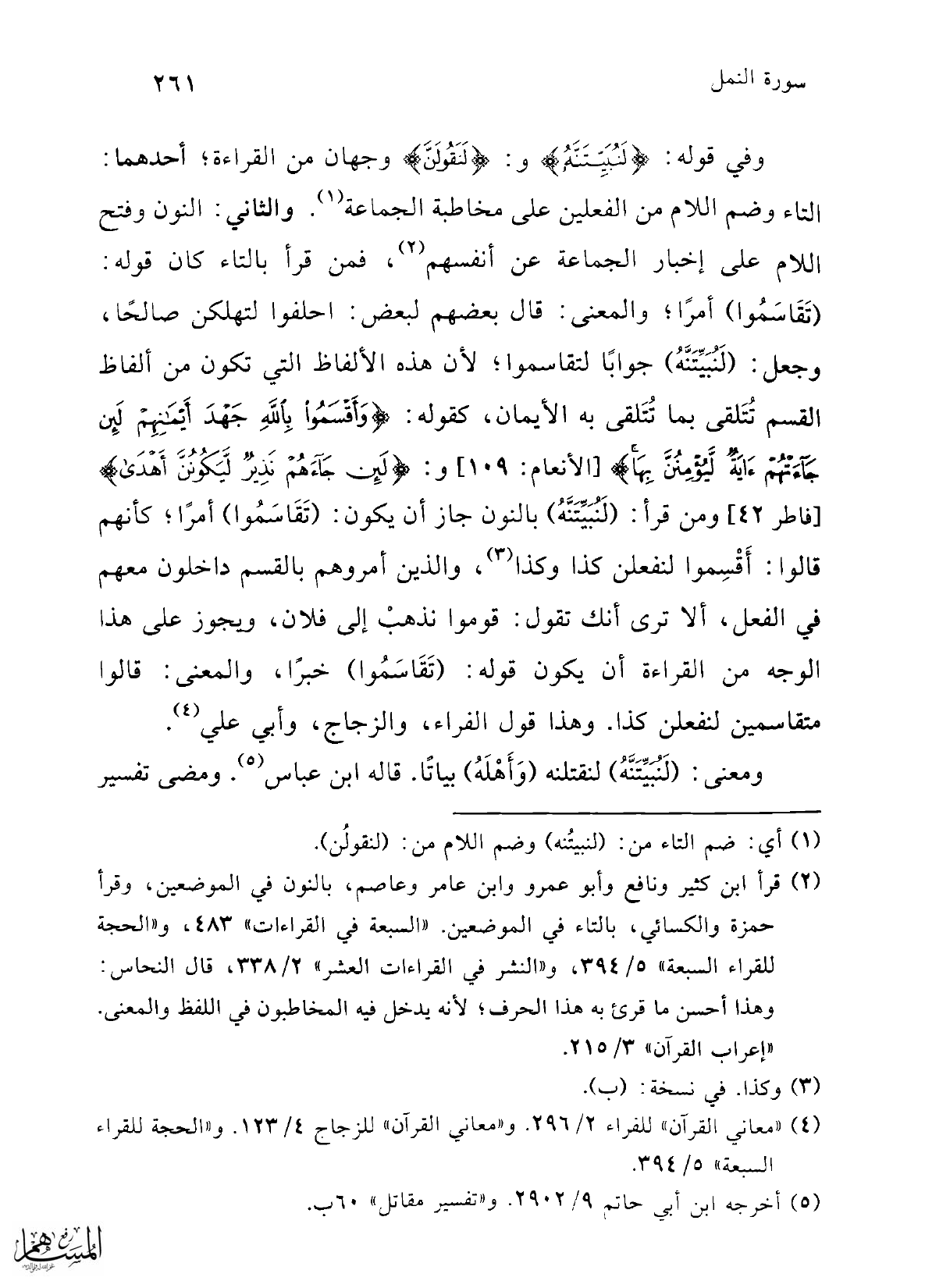 وفي قوله: {لَنُبَيِّتَنَّهُ} و: {لَنَقُولَنَّ} وجهان من القراءة؛ أحدهما: التاء وضم اللام من الفعلين على مخاطبة الجماعة (¬1). والثاني: النون وفتح اللام على إخبار الجماعة عن أنفسهم (¬2)، فمن قرأ بالتاء كان قوله: {تَقَاسَمُوا} أمرًا؛ والمعنى: قال بعضهم لبعض: احلفوا لتهلكن صالحًا، وجعل: {لَنُبَيِّتَنَّهُ} جوابًا لتقاسموا؛ لأن هذه الألفاظ التي تكون من ألفاظ القسم تُتَلقى بما تُتَلقى به الأيمان، كقوله: {وَأَقْسَمُوا بِاللَّهِ جَهْدَ أَيْمَانِهِمْ لَئِنْ جَاءَتْهُمْ آيَةٌ لَيُؤْمِنُنَّ بِهَا} [الأنعام: 109] و: {لَئِنْ جَاءَهُمْ نَذِيرٌ لَيَكُونُنَّ أَهْدَى} [فاطر 42] ومن قرأ: {لَنُبَيِّتَنَّهُ} بالنون جاز أن يكون: {تَقَاسَمُوا} أمرًا؛ كأنهم قالوا: أَقْسِموا لنفعلن كذا وكذا (¬3)، والذين أمروهم بالقسم داخلون معهم في الفعل، ألا ترى أنك تقول: قوموا نذهبْ إلى فلان، ويجوز على هذا الوجه من القراءة أن يكون قوله: {تَقَاسَمُوا} خبرًا، والمعنى: قالوا متقاسمين لنفعلن كذا. وهذا قول الفراء، والزجاج، وأبي علي (¬4).
