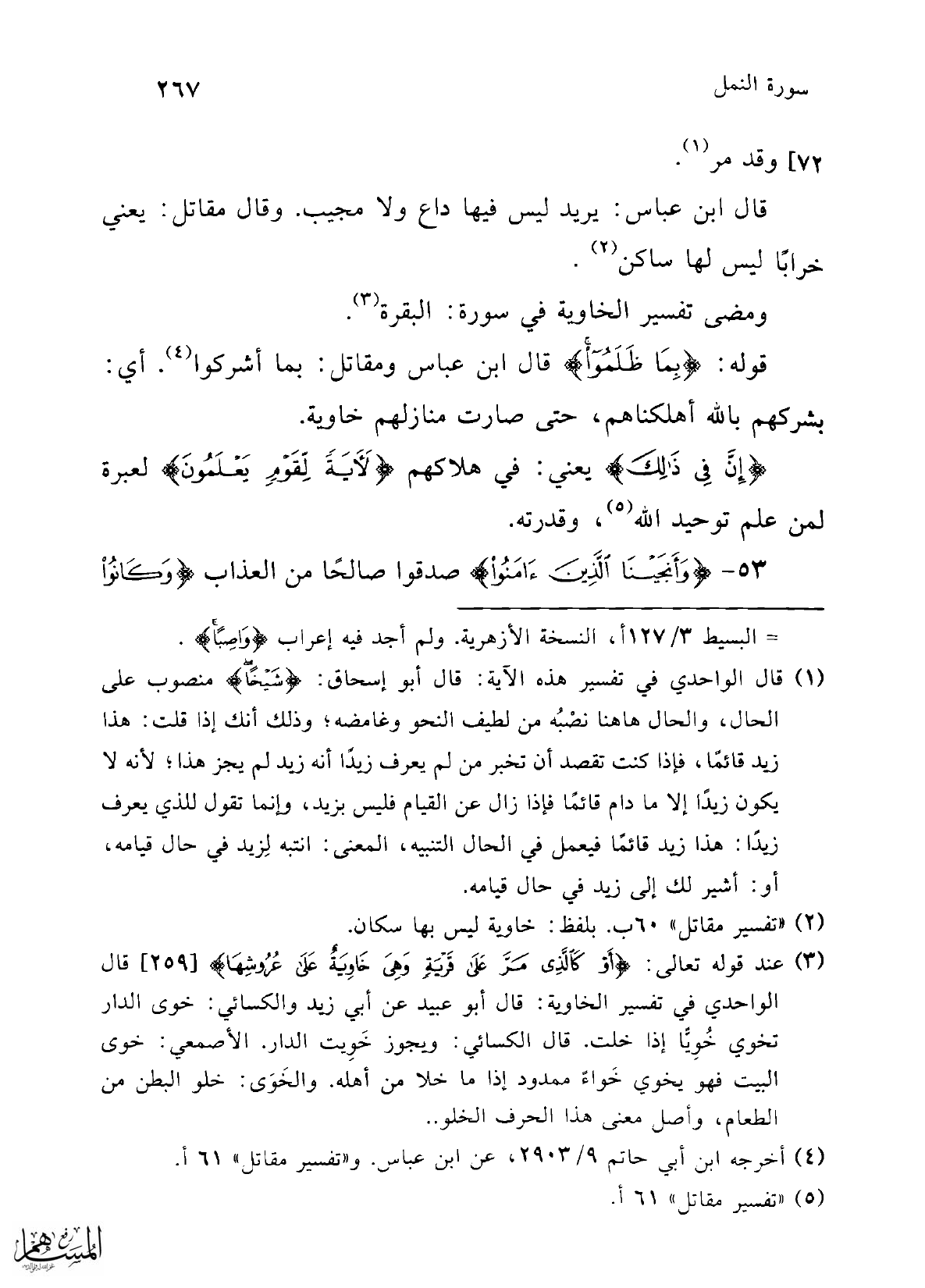 (¬3) عند قوله تعالى: {أَوْ كَالَّذِي مَرَّ عَلَى قَرْيَةٍ وَهِيَ خَاوِيَةٌ عَلَى عُرُوشِهَا} [2591] قال الواحدي في تفسير الخاوية: قال أبو عبيد عن أبي زيد والكسائي: خوى الدار تخوي خُوِيًّا إذا خلت. قال الكسائي: ويجوز خَوِيت الدار. الأصمعي: خوى البيت فهو ينوي خَواءً ممدود إذا ما خلا من أهله. والخَوَى: خلو البطن من الطعام، وأصل معنى هذا الحرف الخلو ..