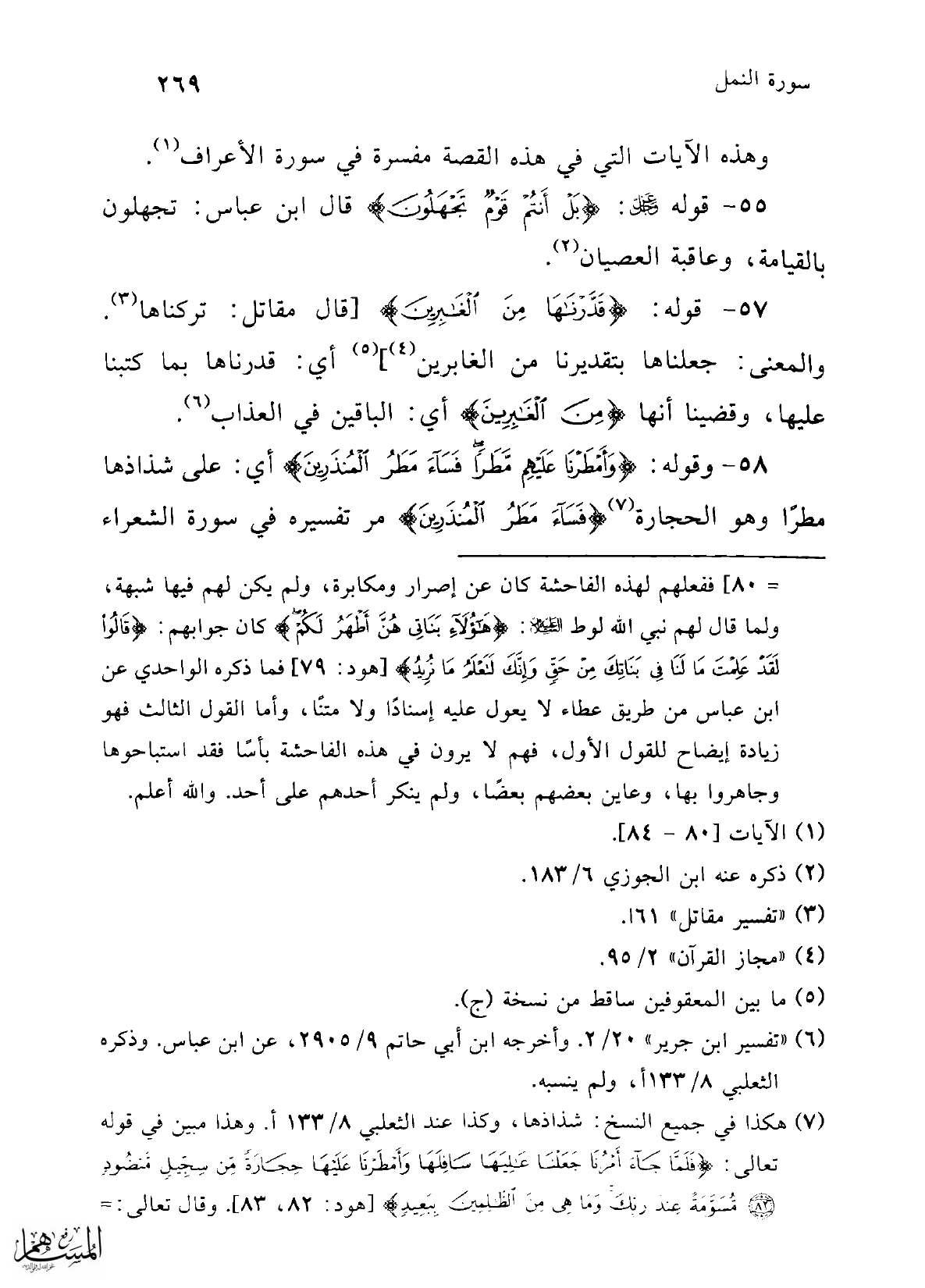 = 80] ففعلهم لهذه الفاحشة كان عن إصرار ومكابرة، ولم يكن لهم فيها شبهة، ولما قال لهم نبي الله لوط عليه السلام: {هَؤُلَاءِ بَنَاتِي هُنَّ أَطْهَرُ لَكُمْ} كان جوابهم: {قَالُوا لَقَدْ عَلِمْتَ مَا لَنَا فِي بَنَاتِكَ مِنْ حَقٍّ وَإِنَّكَ لَتَعْلَمُ مَا نُرِيدُ} [هود: 79] فما ذكره الواحدي عن ابن عباس من طريق عطاء لا يعول عليه إسنادًا ولا متنًا، وأما القول الثالث فهو زيادة إيضاح للقول الأول، فهم لا يرون في هذه الفاحشة بأسًا فقد استباحوها وجاهروا بها، وعاين بعضهم بعضًا، ولم ينكر أحدهم على أحد. والله أعلم.