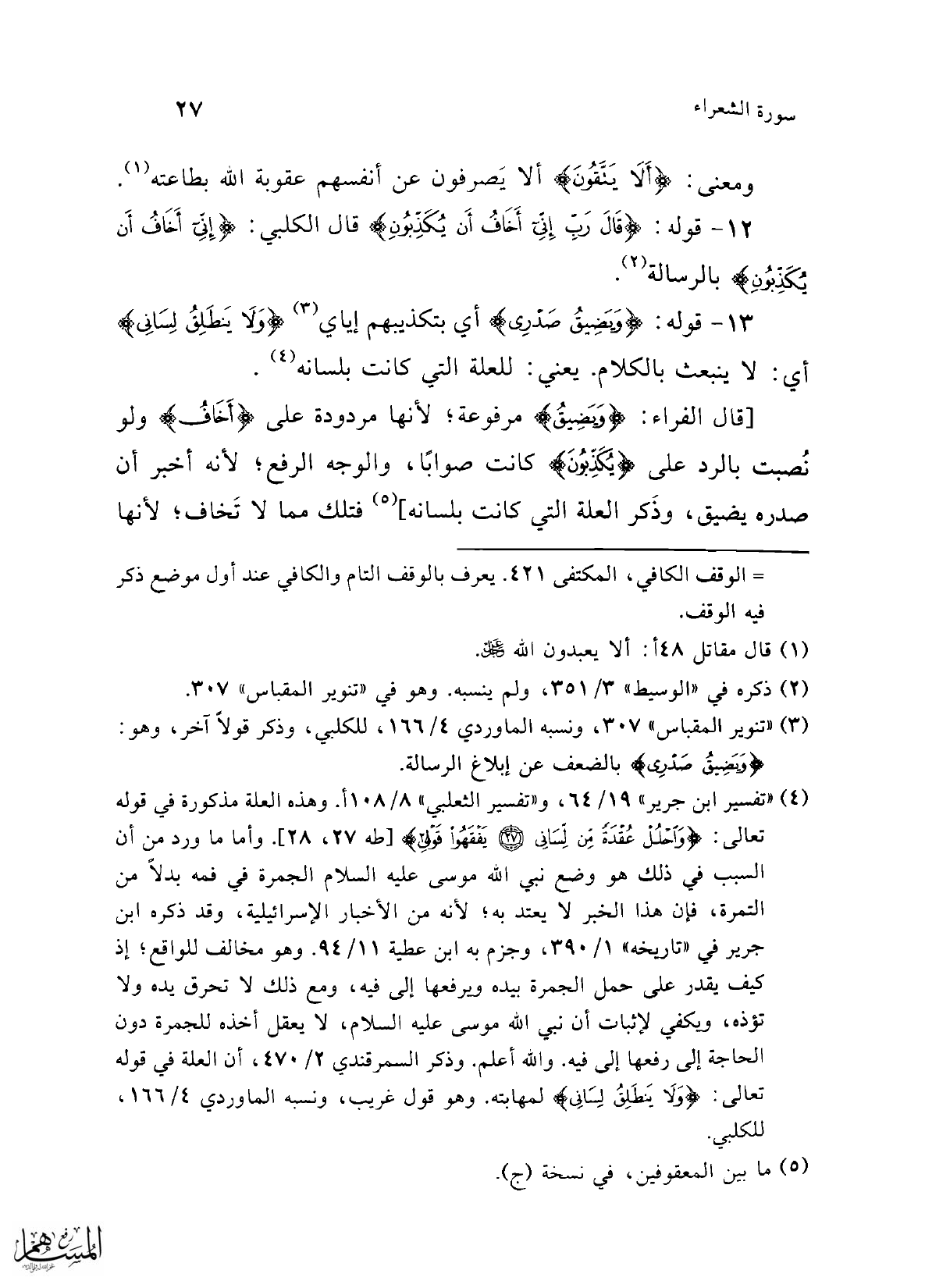 (¬3) "تنوير المقباس" 307، ونسبه الماوردي 4/ 166، للكلبي، وذكر قولاً آخر، وهو: {وَيَضِيقُ صَدْرِي} بالضعف عن إبلاغ الرسالة.