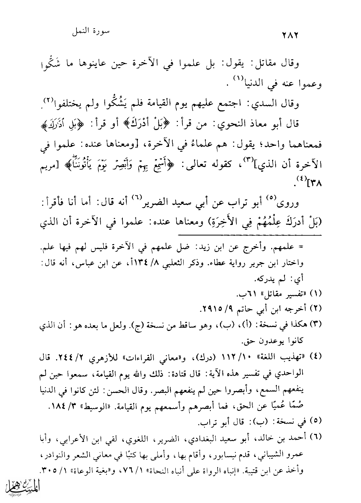 وروى (¬5) أبو تراب عن أبي سعيد الضرير (¬6) أنه قال: أما أنا فأقرأ: (بَلْ أدرَكَ عِلْمُهُمْ فِي الأَخِرَةِ) ومعناها عنده: علموا في الآخرة أن الذي