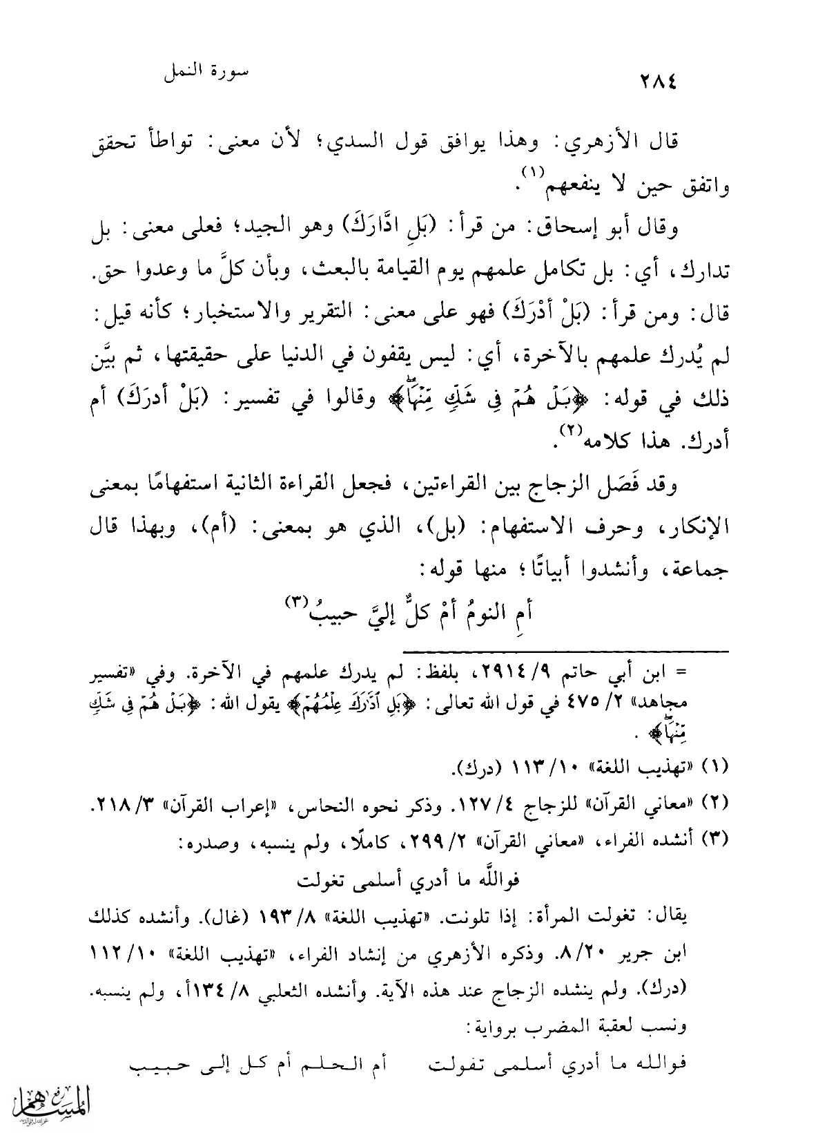 وقال أبو إسحاق: من قرأ: (بَلِ ادَّارَكَ) وهو الجيد؛ فعلى معنى: بل تدارك، أي: بل تكامل علمهم يوم القيامة بالبعث، وبأن كلَّ ما وعدوا حق. قال: ومن قرأ: (بَلْ أدْرَكَ) فهو على معنى: التقرير والاستخبار؛ كأنه قيل: لم يُدرك علمهم بالآخرة، أي: ليس يقفون في الدنيا على حقيقتها، ثم بيَّن ذلك في قوله: {بَلْ هُمْ فِي شَكٍّ مِنْهَا} وقالوا في تفسير: (بَلْ أدرَكَ) أم أدرك. هذا كلامه (¬2).