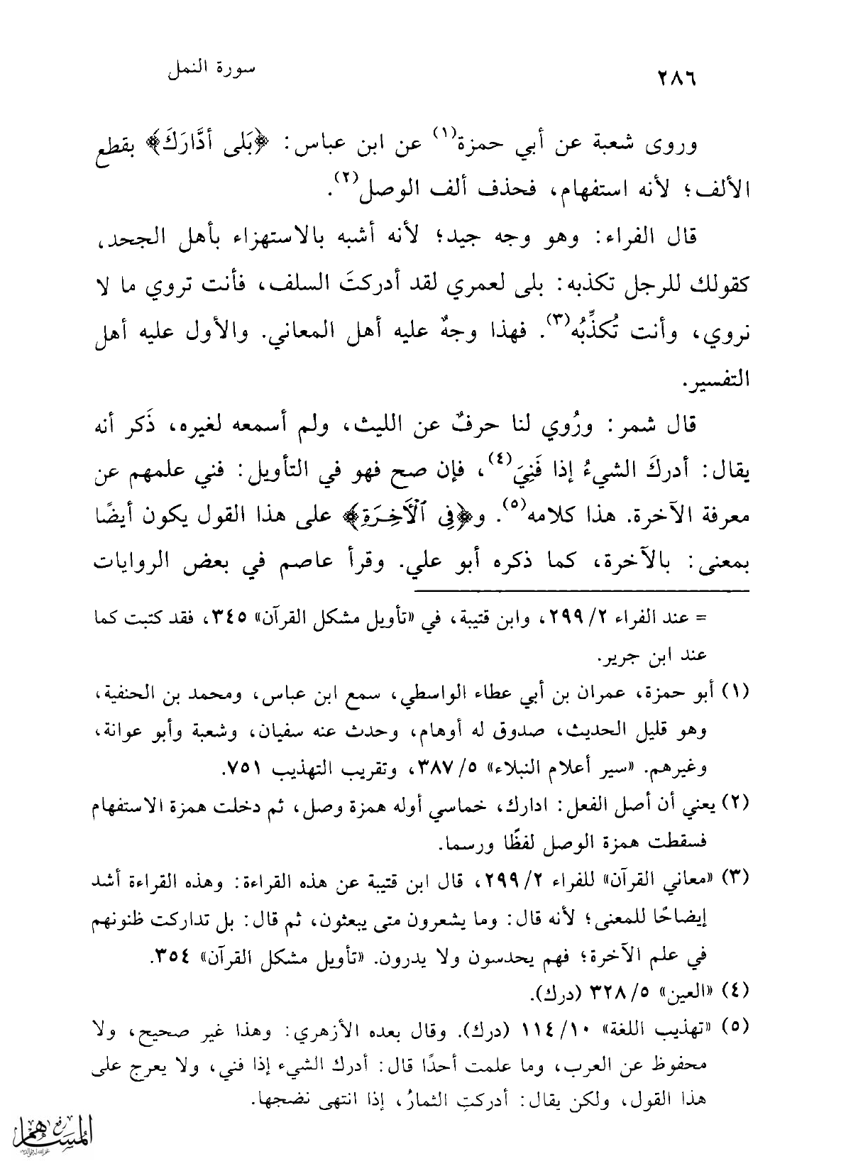 (¬3) "معاني القرآن" للفراء 2/ 299، قال ابن قتيبة عن هذه القراءة: وهذه القراءة أشد إيضاحًا للمعنى؛ لأنه قال: وما يشعرون متى يبعثون، ثم قال: بل تداركت ظنونهم في علم الآخرة؛ فهم يحدسون ولا يدرون. "تأويل مشكل القرآن" 354.